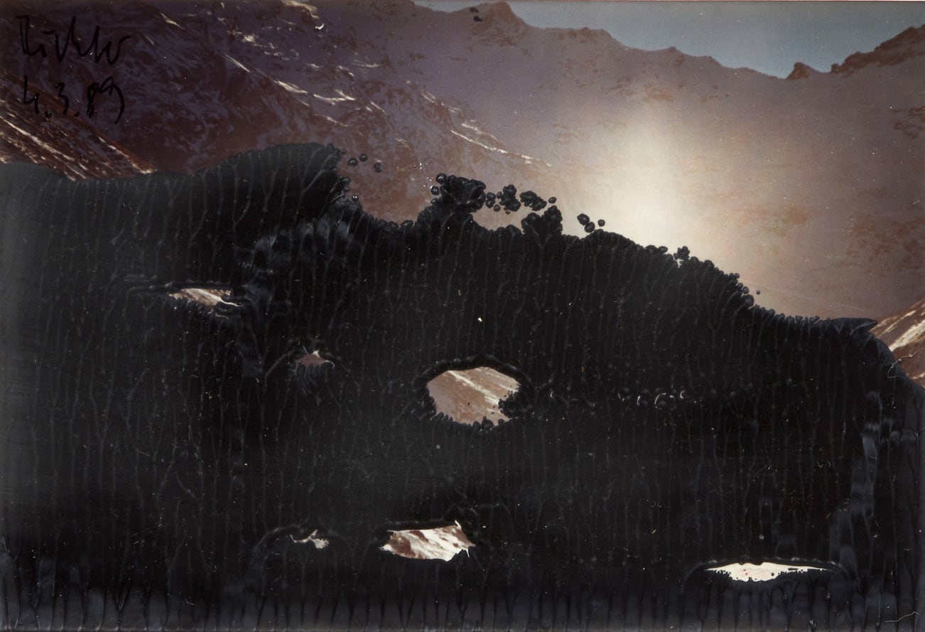 In 1989 Gerhard Richter began his overpainted photographs series as a means of exploring the tension between painting and photography. This image, taken in April of that year, is one of the earliest prints from this body of work. With the heavy application of paint applied to a photograph of snow-topped mountains, Richter immediately disrupts the depth of field and brings a heightened awareness to the surface quality of the photograph and paint, alike.