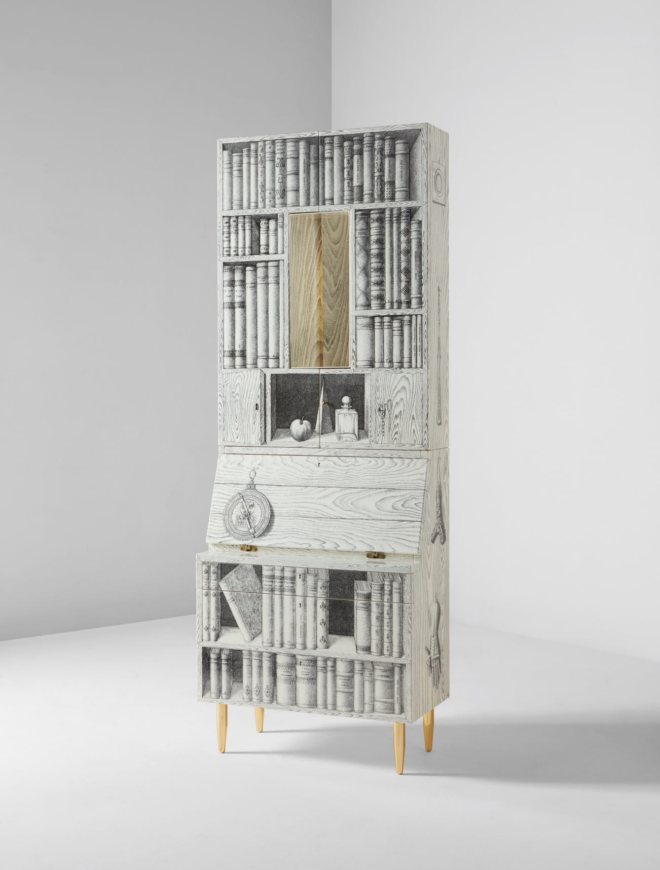 Lithographic transfer-printed wood, lithographic transfer-printed steel, painted wood, brass, glass.