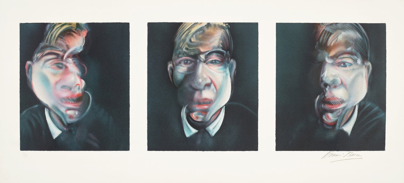 In conversation with yet challenging the conventions of Modern art, Bacon was known for his triptychs brutalizing formalist truths, particularly Three Studies for Figures at the Base of a Crucifixion, which Bacon debuted in London in 1944, and Three Studies of Lucian Freud, which became famous when it set the record for most expensive work of art at auction at the time it sold in 2013.