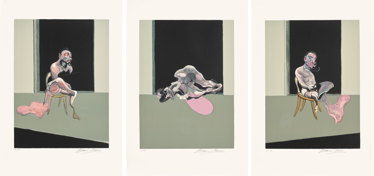 In conversation with yet challenging the conventions of Modern art, Bacon was known for his triptychs brutalizing formalist truths, particularly Three Studies for Figures at the Base of a Crucifixion, which Bacon debuted in London in 1944, and Three Studies of Lucian Freud, which became famous when it set the record for most expensive work of art at auction at the time it sold in 2013.