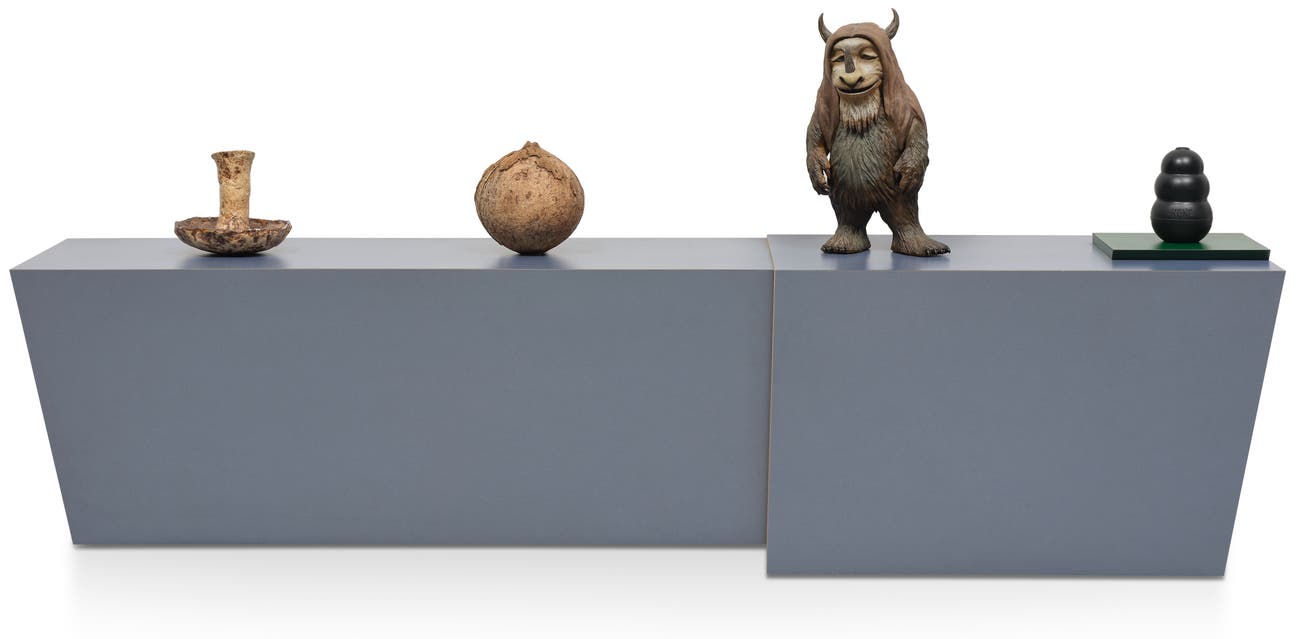 plastic laminated wood shelf, paper maché mushroom, coconut, "Where the Wild Things Are" toy and dog chew