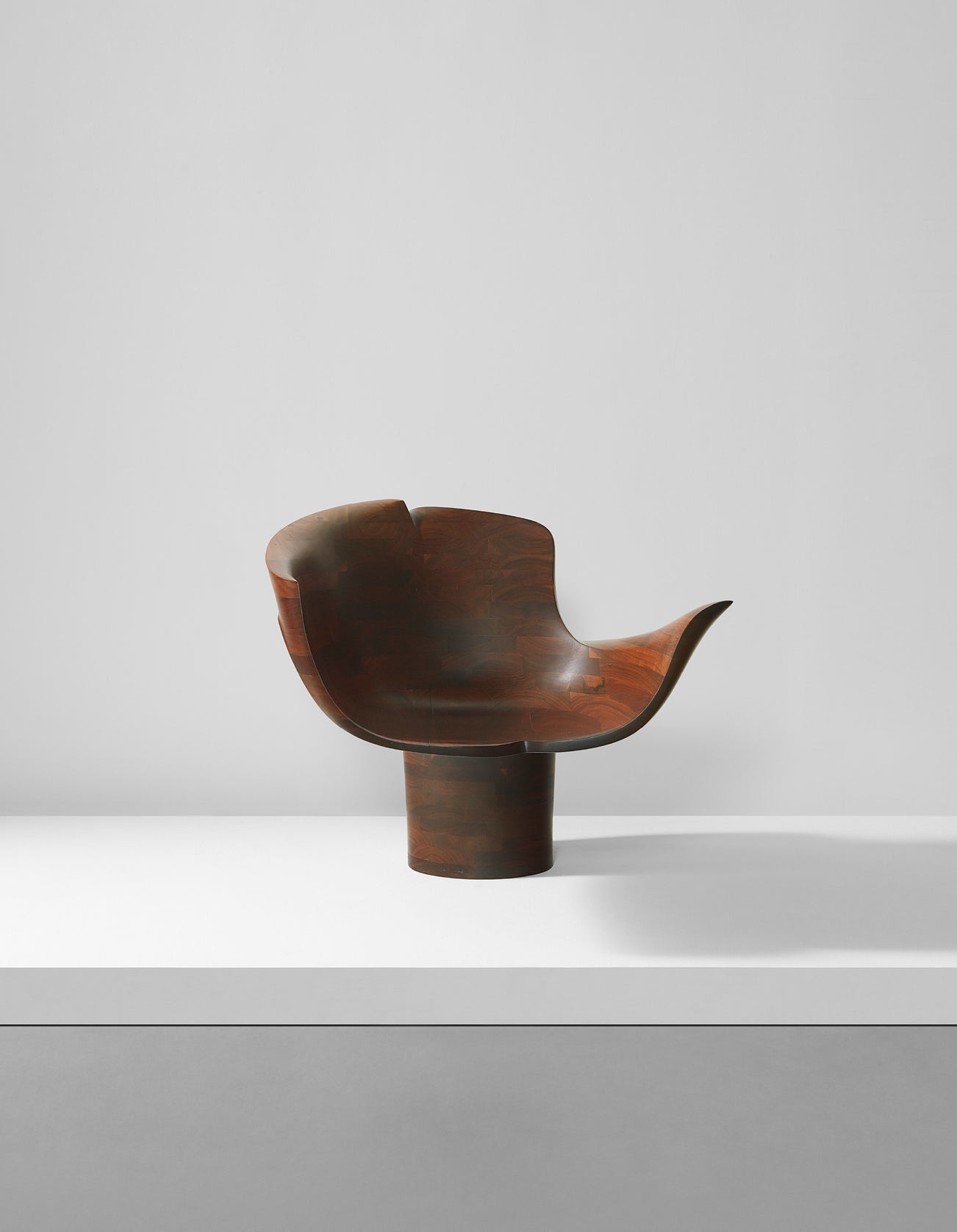 While the present "Pedestal" chair was acquired directly from Wendell Castle by the current owner in 2005, it appears in images of dealer and curator Lee Nordness's Upper East Side living room from circa 1967. In addition to the chair, for Nordness's residence Castle created a monumental sculptural sofa, a leaf-shaped coffee table, and a floor lamp. Castle was 35 years old at the time, teaching furniture design at the School for American Craftsmen at the Rochester Institute of Technology. With this living room, as well as a dining room created for Mr. and Mrs. Douglas Baker of Rochester, New York, Castle had embarked on an important new phase of his career, re-envisioning interiors as landscapes of massive sculptural furniture. Following this commission, in April 1968 Nordness exhibited ten of Castle's designs at his namesake New York gallery. Castle described his process for a 1968 New York Times feature on the occasion of this exhibition: "I begin with an idea and sketch of what I want. Each piece of furniture is done one-inch layer by one-inch layer, cutting and gluing as I go. There is a point where it is difficult to imagine where a chair is going." The following year, Nordness included Castle in his seminal traveling exhibition "Objects: USA." Nordness later gifted his living room furniture to The Art Institute of Chicago; a similar, yet different pedestal chair resides in this collection.