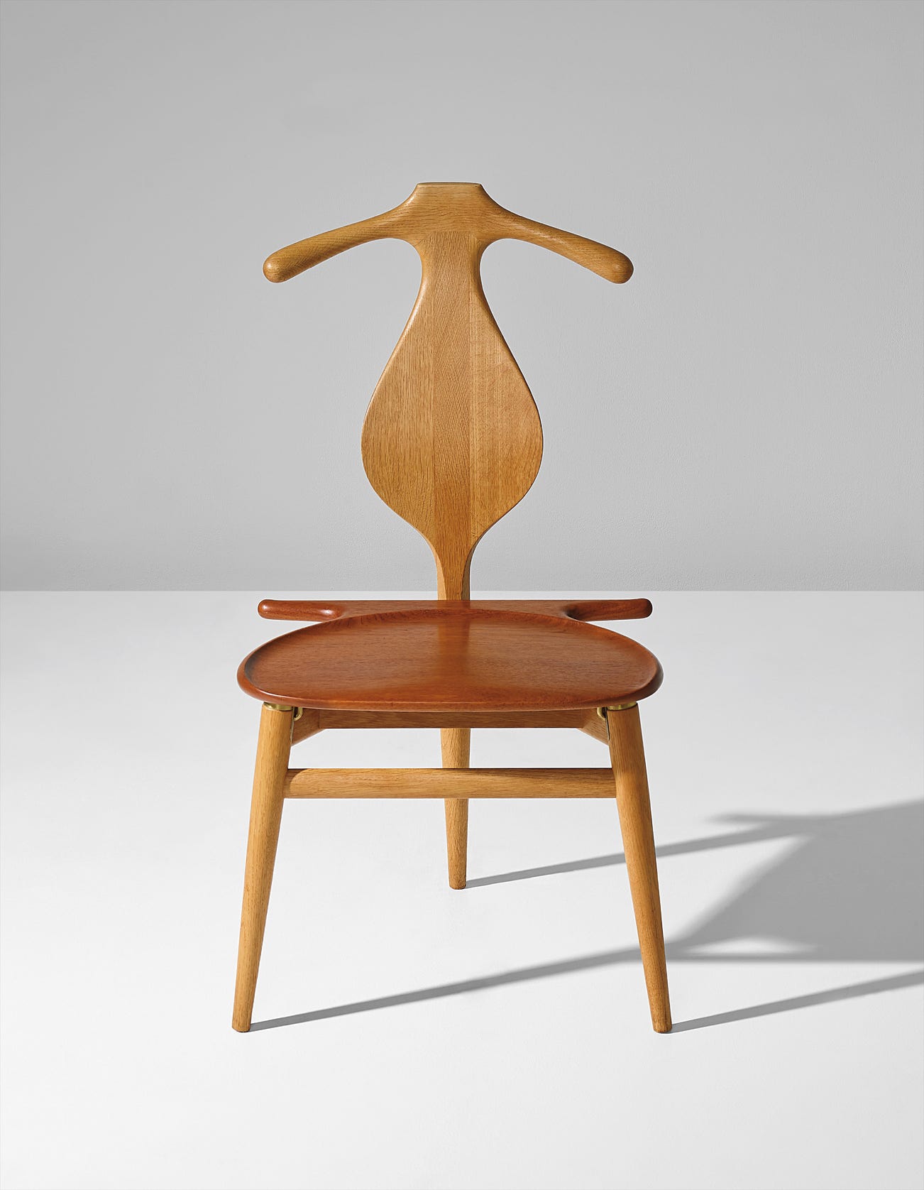 本件拍品由建築師漢斯·韋格納於1953年設計,其有機形態俏皮地融合了多種功能性。正如作品名背後的巧思,這件頗具獨創性的椅子可以轉化為放置衣物的架子,且餘有一個小空間可以儲藏私人物品。正如韋格納所述,「椅子是與人最親近的家具。你可以讓它展現人性化的一面」。韋格納、建築教授斯坦·埃勒拉·斯穆森、銀器匠及設計師卡伊·博喬森曾在討論這件椅子起源時提到它源自入睡時無處掛置西裝的困擾。