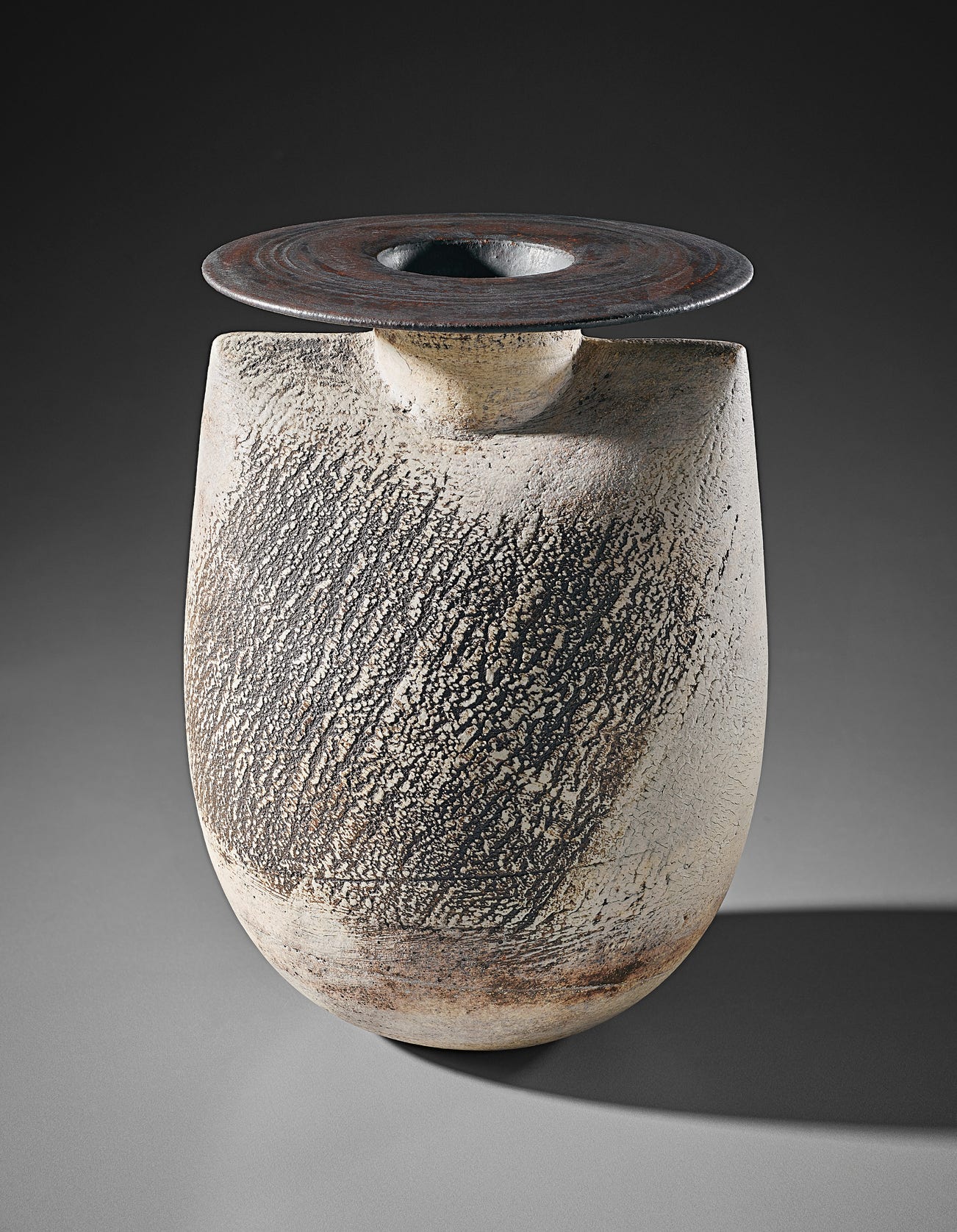 Coper favored compound shapes that, while simple in appearance, were in fact complex in construction. Similar to the making of Joseon Dynasty Moon Jars (Rie in fact displayed a Moon Jar in the studio), he would build his vessels by bringing several thrown forms together, for example joining bowls rim to rim. Coper eschewed glazes and preferred the textured surfaces achieved through the application of white and black slips, evoking the abraded texture of excavated vessels. This interest in ancient objects was very much in step with other modernists of his time—Coper admired Constantin Brancusi and Alberto Giacometti and his textured markings have been compared to sculptors such as William Turnbull.