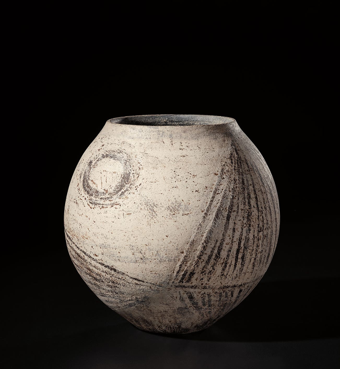 Coper favored compound shapes that, while simple in appearance, were in fact complex in construction. Similar to the making of Joseon Dynasty Moon Jars (Rie in fact displayed a Moon Jar in the studio), he would build his vessels by bringing several thrown forms together, for example joining bowls rim to rim. Coper eschewed glazes and preferred the textured surfaces achieved through the application of white and black slips, evoking the abraded texture of excavated vessels. This interest in ancient objects was very much in step with other modernists of his time—Coper admired Constantin Brancusi and Alberto Giacometti and his textured markings have been compared to sculptors such as William Turnbull.