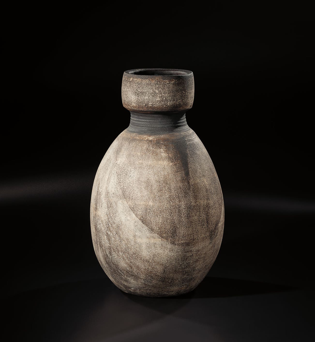 Coper favored compound shapes that, while simple in appearance, were in fact complex in construction. Similar to the making of Joseon Dynasty Moon Jars (Rie in fact displayed a Moon Jar in the studio), he would build his vessels by bringing several thrown forms together, for example joining bowls rim to rim. Coper eschewed glazes and preferred the textured surfaces achieved through the application of white and black slips, evoking the abraded texture of excavated vessels. This interest in ancient objects was very much in step with other modernists of his time—Coper admired Constantin Brancusi and Alberto Giacometti and his textured markings have been compared to sculptors such as William Turnbull.