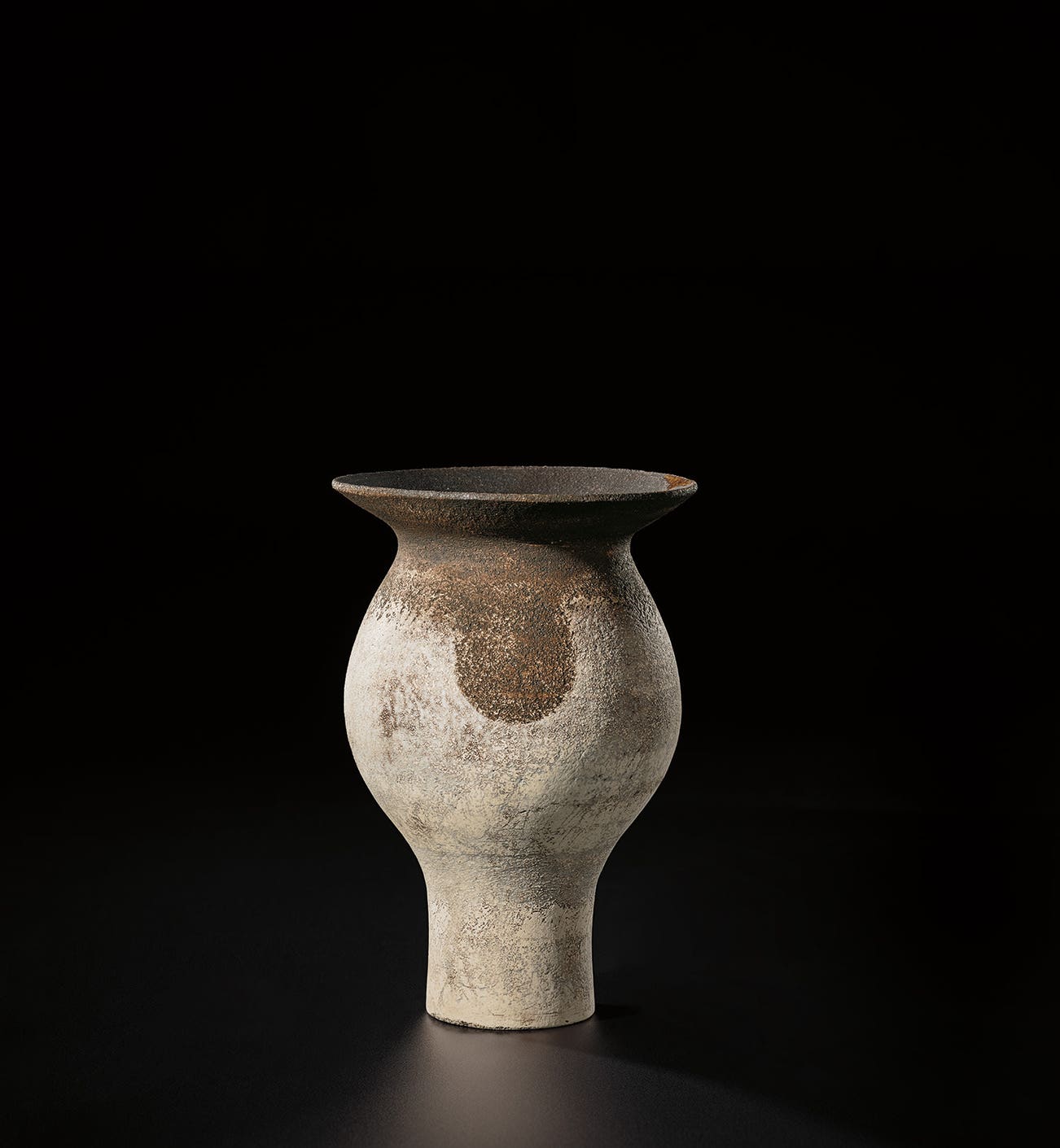 In the last phase of his career, Coper reduced the scale of his work creating small "Cycladic" pots that stood on pedestals or drums, recalling the clay figures of Bronze Age Greece.