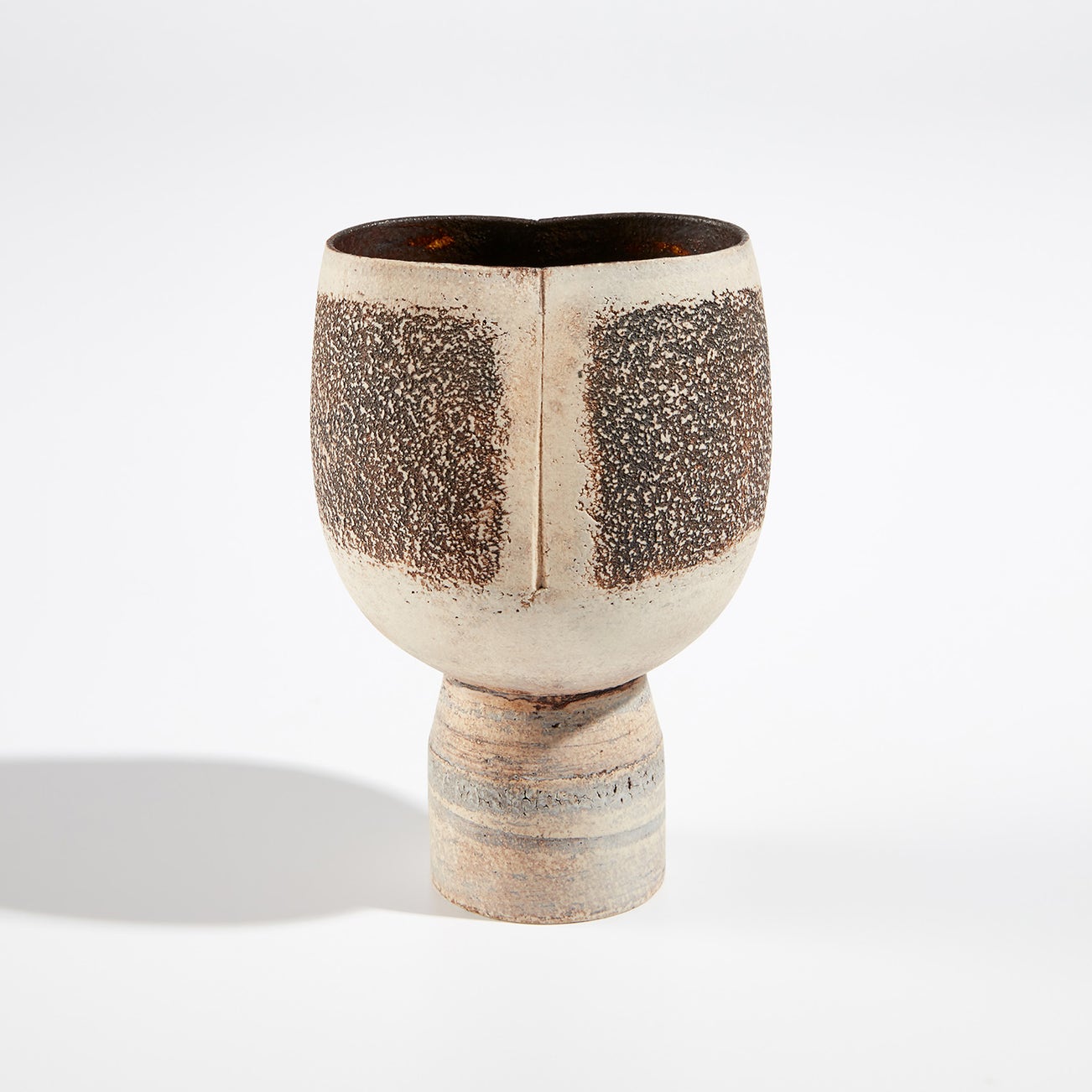 Coper favored compound shapes that, while simple in appearance, were in fact complex in construction. Similar to the making of Joseon Dynasty Moon Jars (Rie in fact displayed a Moon Jar in the studio), he would build his vessels by bringing several thrown forms together, for example joining bowls rim to rim. Coper eschewed glazes and preferred the textured surfaces achieved through the application of white and black slips, evoking the abraded texture of excavated vessels. This interest in ancient objects was very much in step with other modernists of his time—Coper admired Constantin Brancusi and Alberto Giacometti and his textured markings have been compared to sculptors such as William Turnbull.