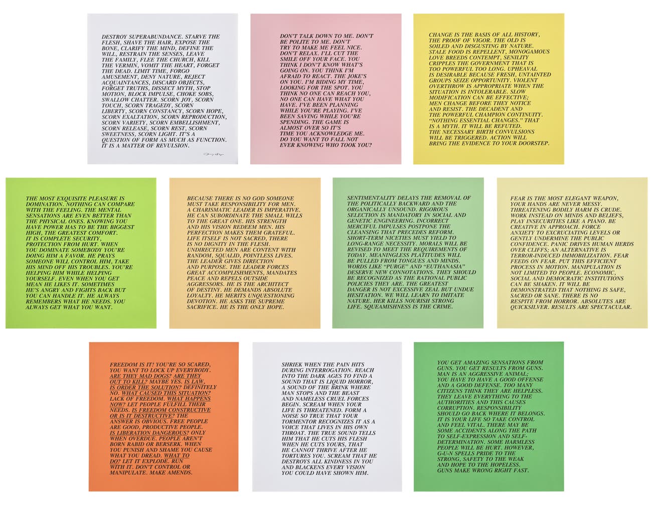 American | 1950Jenny Holzer is a Conceptual artist best known for her text-based public art projects. Holzer's work speaks of violence, oppression, sexuality, feminism, power, war and death. Throughout the years, Holzer has employed a variety of media, from a T-shirt to a plaque to an LED sign. Starting in the 1970s with the New York City posters, and continuing through her recent light projections on landscape and architecture, she uses her art as a form of communication and commentary. Holzer's art hangs in important collections around the globe including 7 World Trade Center, the Venice Biennale, the Guggenheim Museums in New York and Bilbao and the Whitney Museum of American Art.