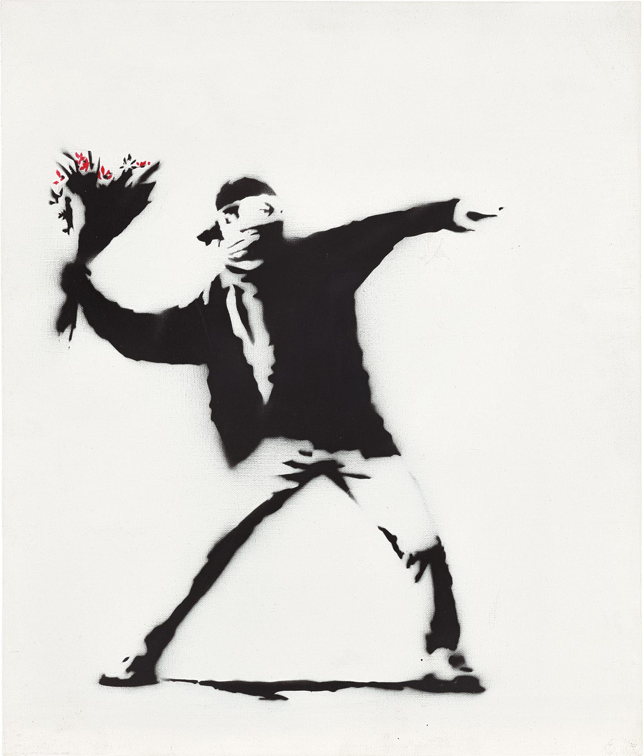 His graffiti, paintings and screenprints use whimsy and humour to satirically critique war, capitalism, hypocrisy and greed — with not even the Royal family safe from his anti-establishment wit.