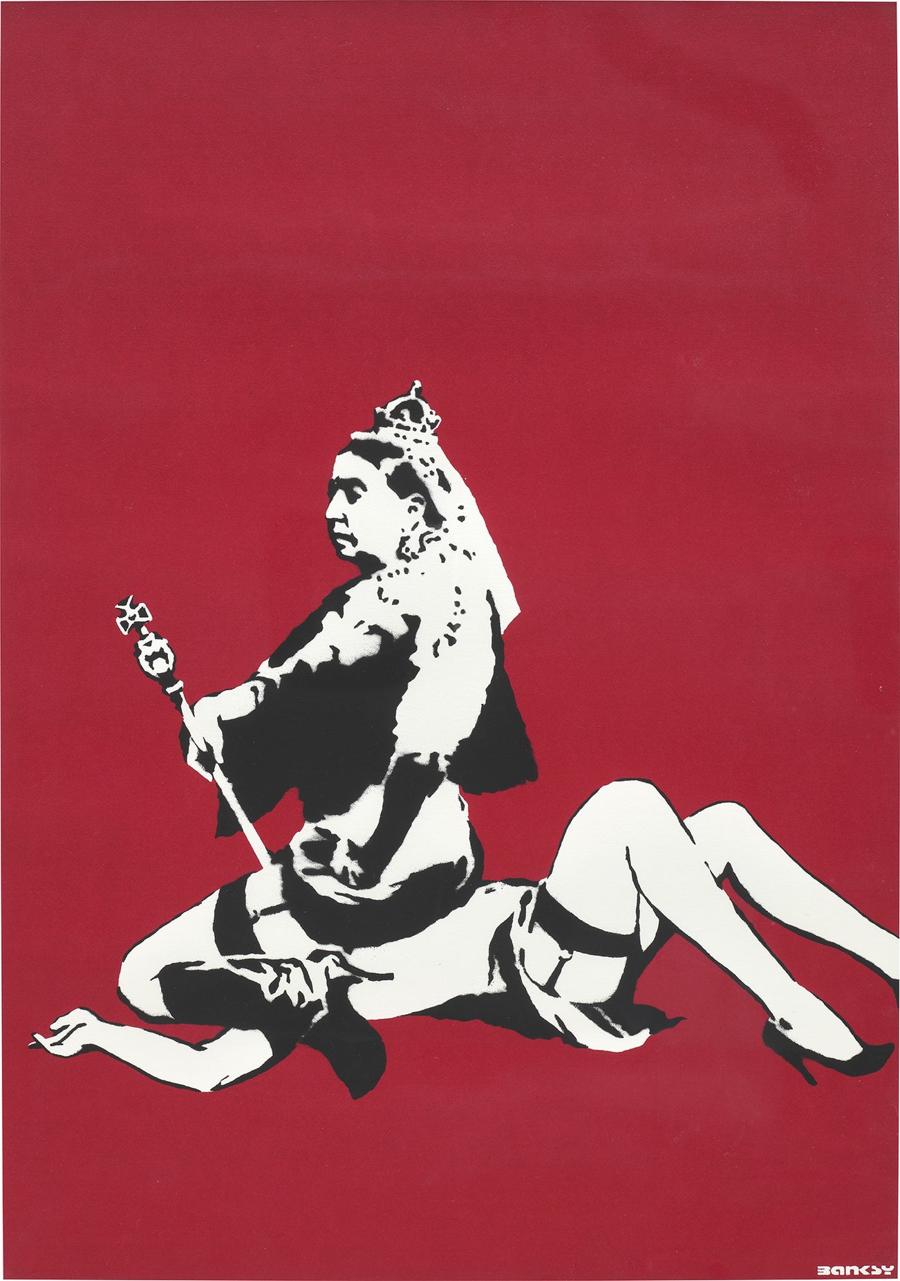 His graffiti, paintings and screenprints use whimsy and humour to satirically critique war, capitalism, hypocrisy and greed — with not even the Royal family safe from his anti-establishment wit.