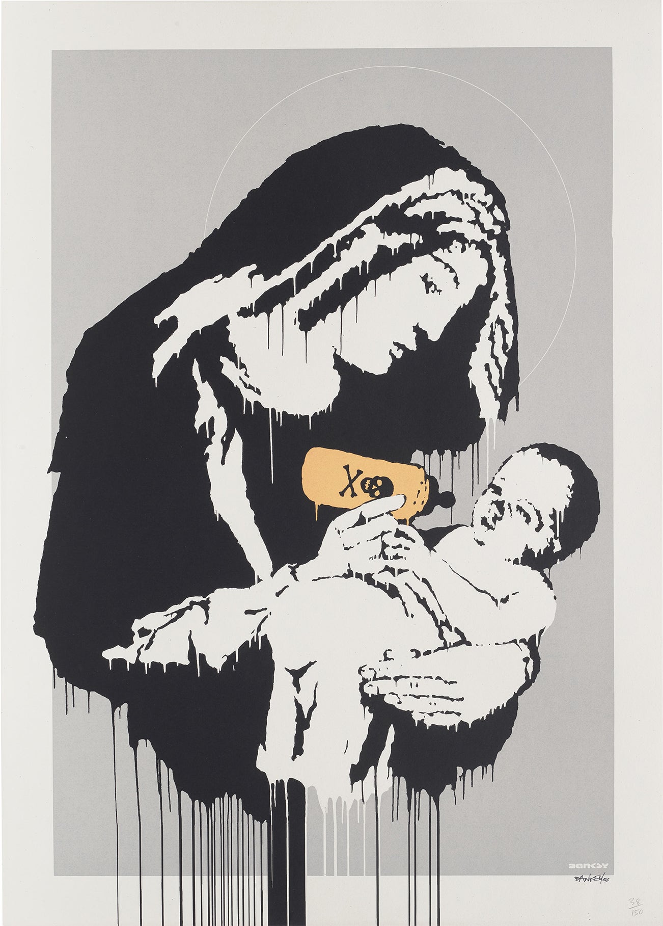 Anonymous street artist Banksy first turned to graffiti as a miserable fourteen year old disillusioned with school. Inspired by the thriving graffiti community in his home city, Bristol, Banksy's works began appearing on trains and walls in 1993, and by 2001 his blocky, spray-painted works had cropped up all over the United Kingdom. Typically crafting his images with spray paint and cardboard stencils, Banksy is able to achieve a meticulous level of detail. His aesthetic is clean and instantly readable due to his knack for reducing complex political and social statements to simple visual elements.