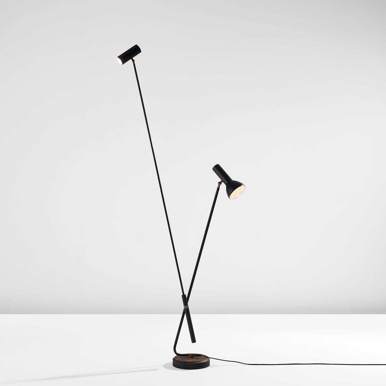 Italian | B. 1912 D. 1985Rising above the devastation of World War II, post-war Italian design reached new heights of productivity and ingenuity, particularly in the realm of lighting. Gino Sarfatti is among the most celebrated lighting designers from this fruitful period. Before founding his company Arteluce in 1939, Sarfatti studied aeronautical engineering. He brought the inventiveness of a self-taught outsider to the field of lighting design, while his mechanical background lent lightness and ingenuity of construction. Poetic underpinnings are also evident in lamps such as model no. 1034 (sometimes referred to as the "Vine" lamp), which features a nearly 8' twisting brass stem graced with nine delicate, articulating white shades like buds on a flower.