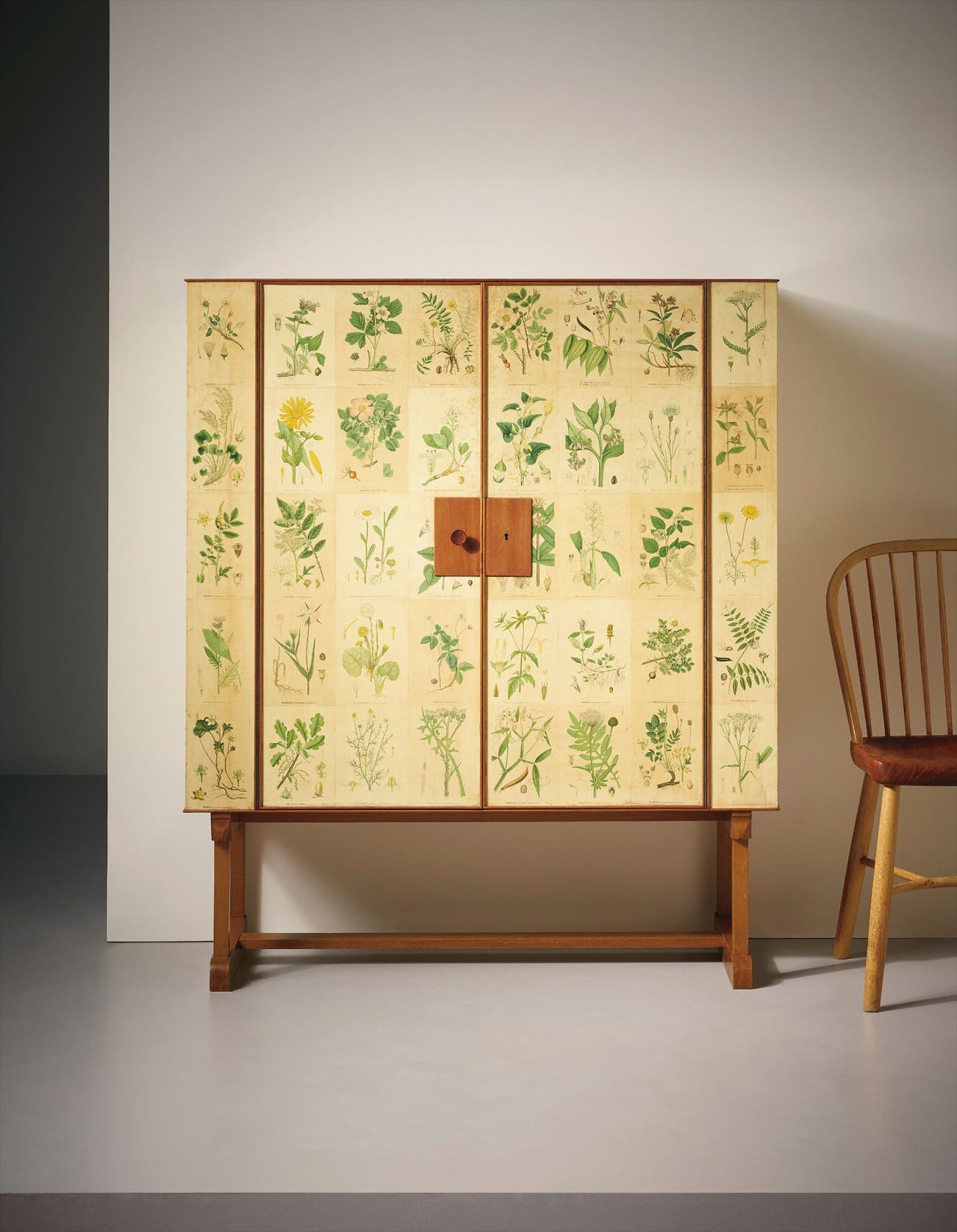 An example is the present ‘Flora’ cabinet, for which Frank gleaned illustrations from the book Bilder ur Nordens Flora by Swedish botanist Carl Axel Magnus Lindman. The simple form, reminiscent of a seventeenth-century cabinet-on-stand, references the past yet remains decidedly modern. Frank and Ericson exhibited the same design for an exhibition of five model rooms at Kaufman’s department store in Pittsburgh in 1951—a fitting, nationalistic choice for introducing Swedish design to America.