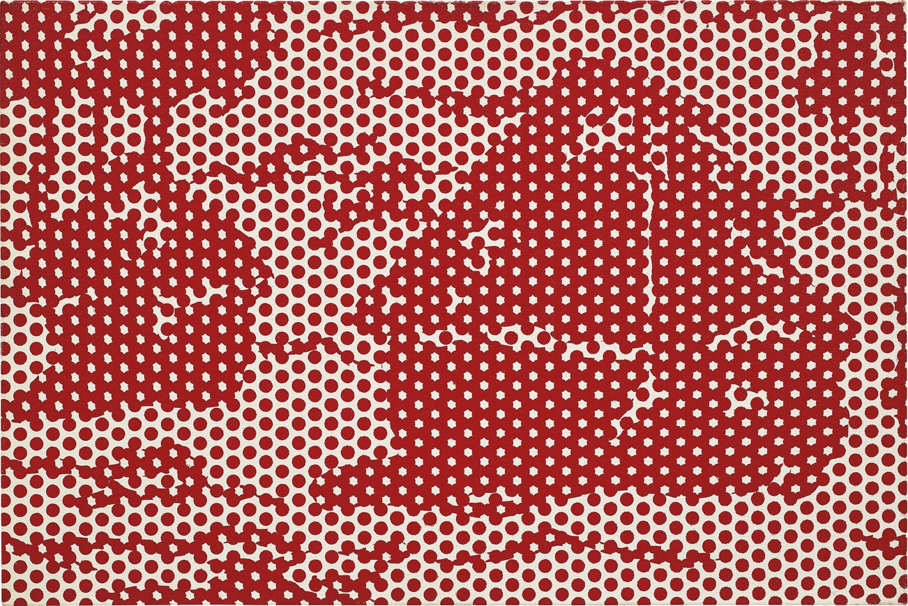 The result of this extremely methodical manner of production, meant to efface any indication of the artist’s hand, is an unperturbed, balanced surface. In this sense, while Monet’s original paintings were optical, subjective depictions of the play of light, Haystacks portrays the automation of the artistic process in the same vein as color reproduction. Typical of his working process, Lichtenstein reproduced the original image by hand before he and his assistants traced his sketch onto the canvas with the help of a projector. Then, they painted the large Ben-Day dots, but instead of featuring Lichtenstein’s customary jet black contours to define shapes and figures, Haystacks’ forms are defined by the concentration of the dots themselves and its resulting illusionistic inversion of red and white. Thus, though Haystacks is more a manifestation of Lichtenstein’s interest in the relationship between flatness and shapes than of the inextricability of color and light, the all-over application of Ben-Day dots and undefined forms still hint at the acute visual sensibility present in the Stacks of Wheat paintings. According to art historian and curator Diane Waldman, by “translating Monet’s subtle arrangements of color into Ben-Day dots in primary colors, Lichtenstein kept the dots just below the level of recognition as discrete forms, and thus came extraordinarily close to capturing Monet’s Impressionist effects” (Diane Waldman, Roy Lichtenstein, exh. cat., Solomon R. Guggenheim Museum, New York, 1993, pp. 146-147).