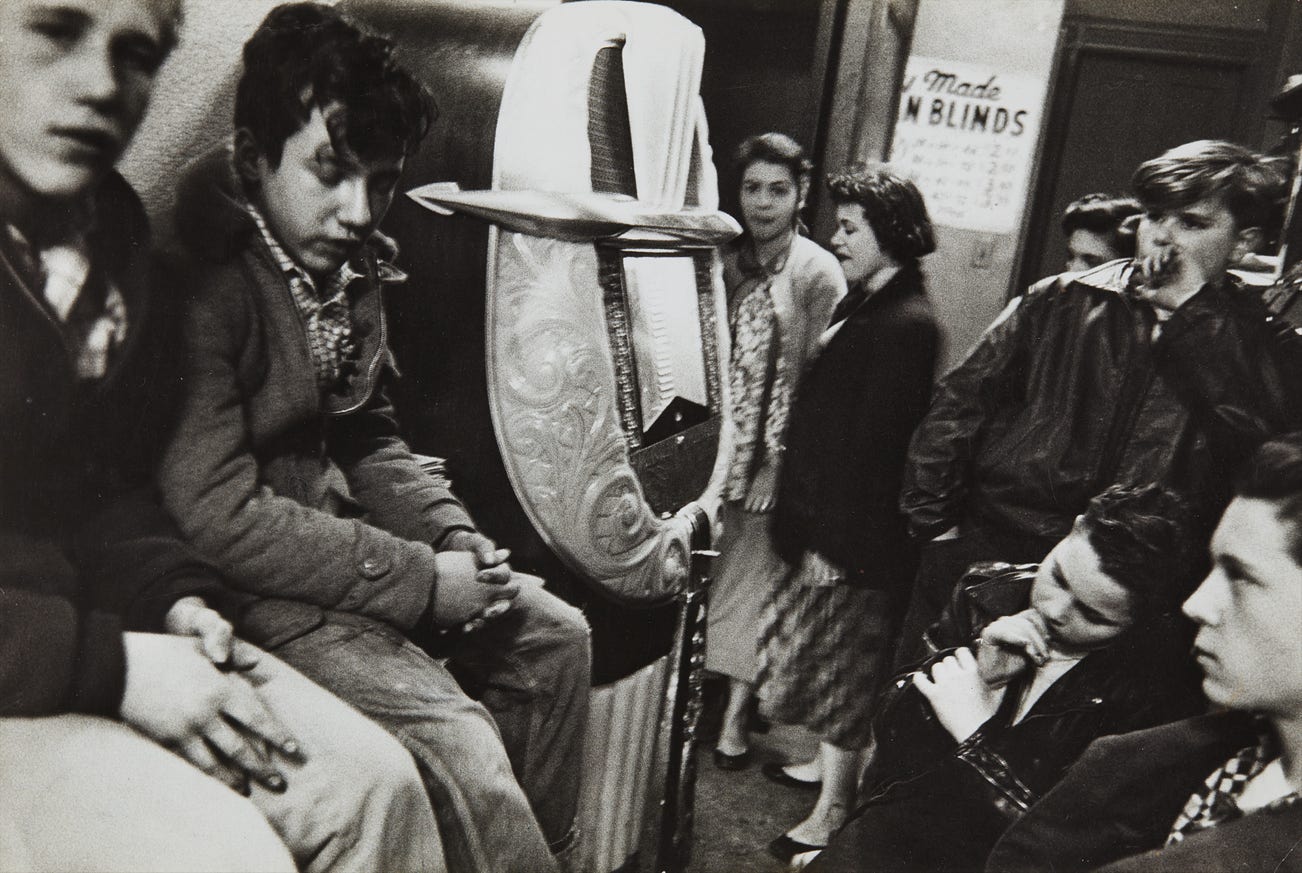 In 1950s America, the jukebox was a ubiquitous presence in bars, restaurants, and diners. With their sleek curves and glowing facades, they were undeniably photogenic. From jukeboxes came the pulsating new sounds of rock-and-roll: a congregation of teenagers crowding around this music machine, as in Candy Store, 86th Street, could not have been more quintessentially American. For Frank, a room with a jukebox was fertile territory to riff on this theme.