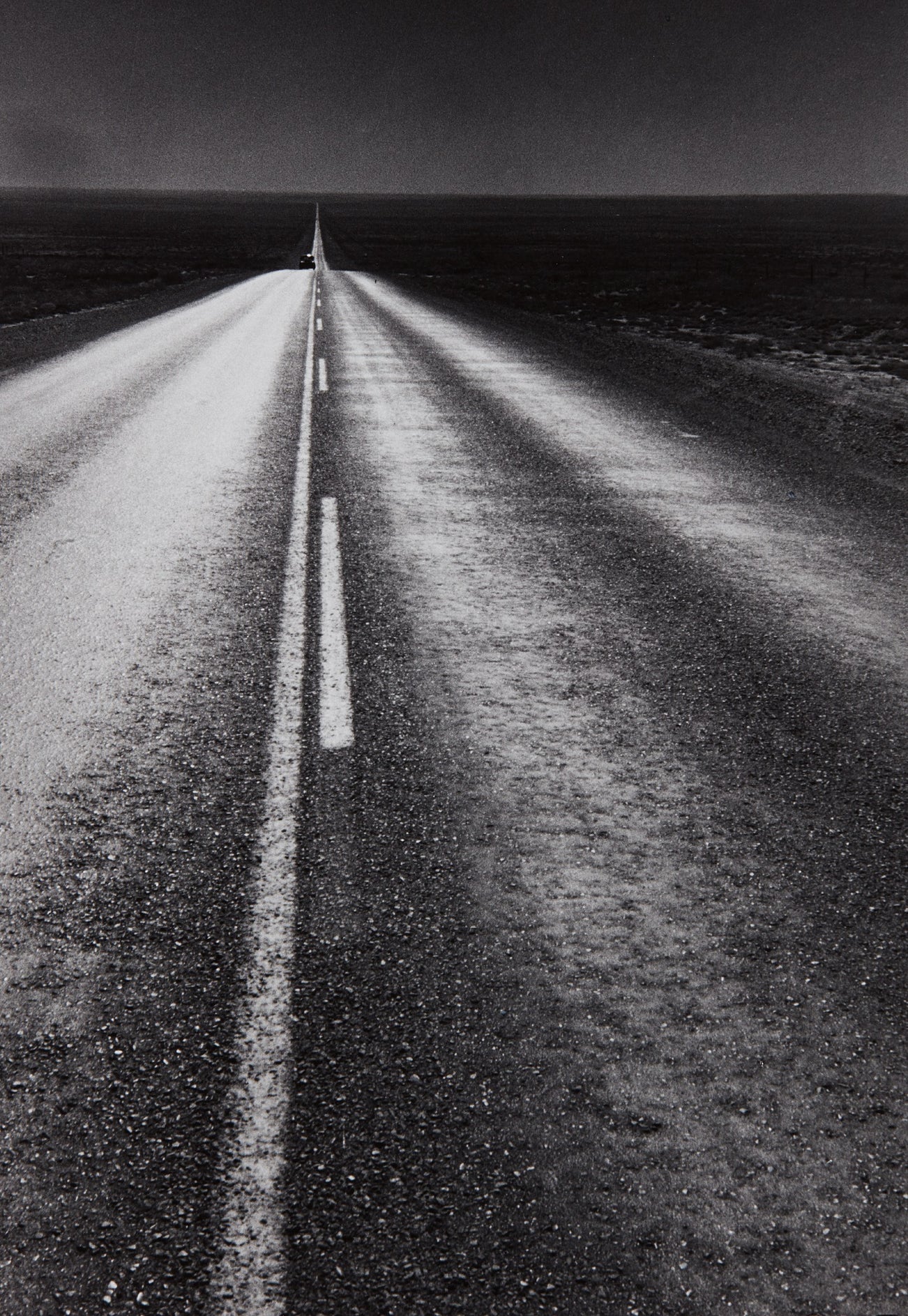 In his application for the Guggenheim Fellowship, Frank declared his intention “to photograph freely throughout the United States, using the miniature camera exclusively. The making of a broad, voluminous picture record of things American, past and present. This project is essentially the visual study of a civilization and will include caption notes; but it is only partly documentary in nature: one of its aims is more artistic than the word documentary implies.” This “more artistic” documentary approach presents itself in US 285, New Mexico, 1956. A deep, dark image of the open road, Frank actually photographed US 285 in the daytime and then underexposed the negative, giving the impression of nighttime’s dramatic obscurity using the filmmaking technique known as ‘day for night.’ The power of this effect, Frank’s artistic vision and uncommon understanding of the American landscape was not lost on Walker Evans, one of his earliest supporters of The Americans, who remarked on this image: “In this picture, instantly you find the continent. The whole page is haunted with American scale and space.”