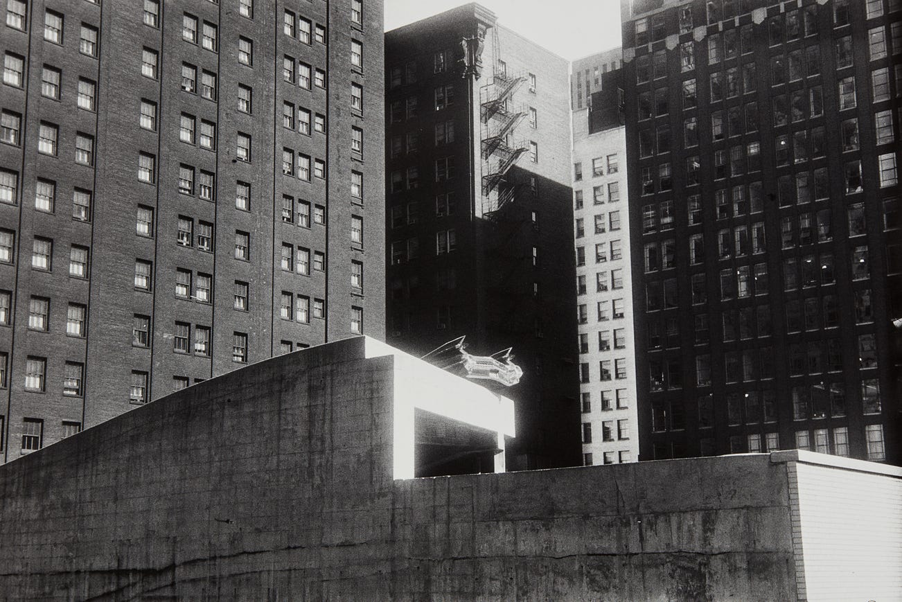 Robert Frank recognized the distinct role the automobile played in mid-century American culture. Having spent an extensive amount of time traveling on the road while creating The Americans, cars became a regular theme in his photographs, grounding his images in both a specific time and place. Taken in the Chicago Loop, Chicago, 1959 captures the rear bumper of a 1959 Cadillac perched at the top of a parking garage, basking in the sunlight, its stylish angularity projecting out from the surrounding rectangular buildings. Shot from below and featuring an almost heavenly bright light shining on the Cadillac, Frank presents the car as an object of reverence and harbinger of the American dream.