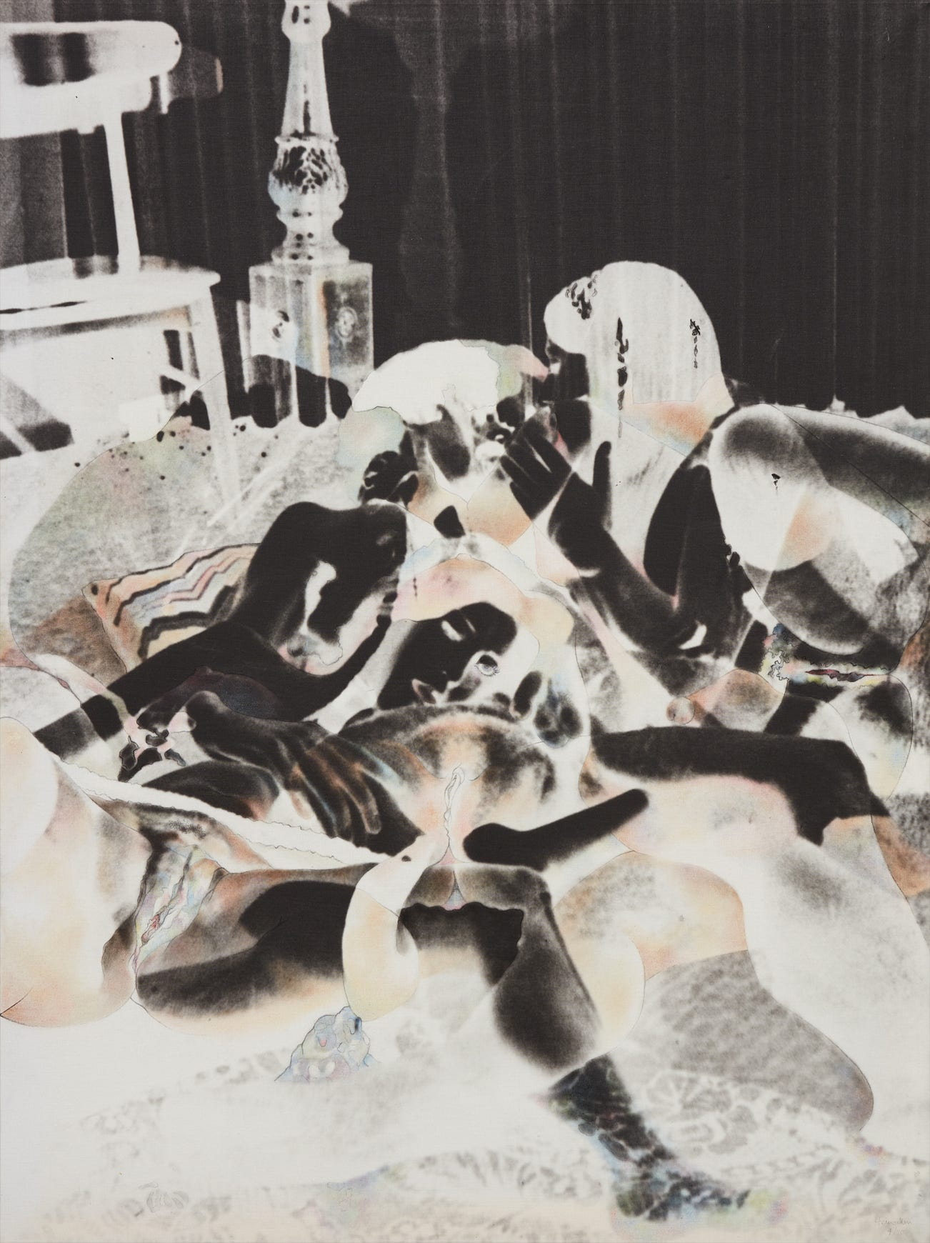 Heinecken winks at us with his title: the real Jack Jones and the Lennon Sisters could not be further from the actors in the image offered here. Instead, we have a photograph likely taken from a pornographic magazine, enlarged to near-monumental size, reversed into a negative, and then applied to canvas. In typical Heinecken fashion, this is an image he experimented with in at least one other work, this time with a more suggestive title: the black-and-white, four-part “Different Strokes . . .” of the same year. A magpie of popular culture, Heinecken mixed and appropriated, reversed and transferred, and combined words with images that created an intellectual, sensory, and sometimes disorienting multi-media experience. He did not consider himself a photographer, but rather, in his words, a “paraphotographer.”
