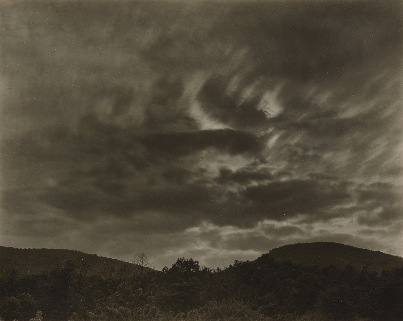 The rolling landscape and open skies of Lake George provided Alfred Stieglitz with an ideal environment in which to experiment and to perfect his Modernist vision. This photograph was made near the Stieglitz family summer home in the 1920s, and is a rare example of one his earliest cloud studies. Like his series Music—A Sequence of Ten Cloud Photographs, Stieglitz made this image with an 8 x 10-inch view camera. The large format allowed for a contact print in which the contours of the land and the formations of the clouds are beautifully described.
