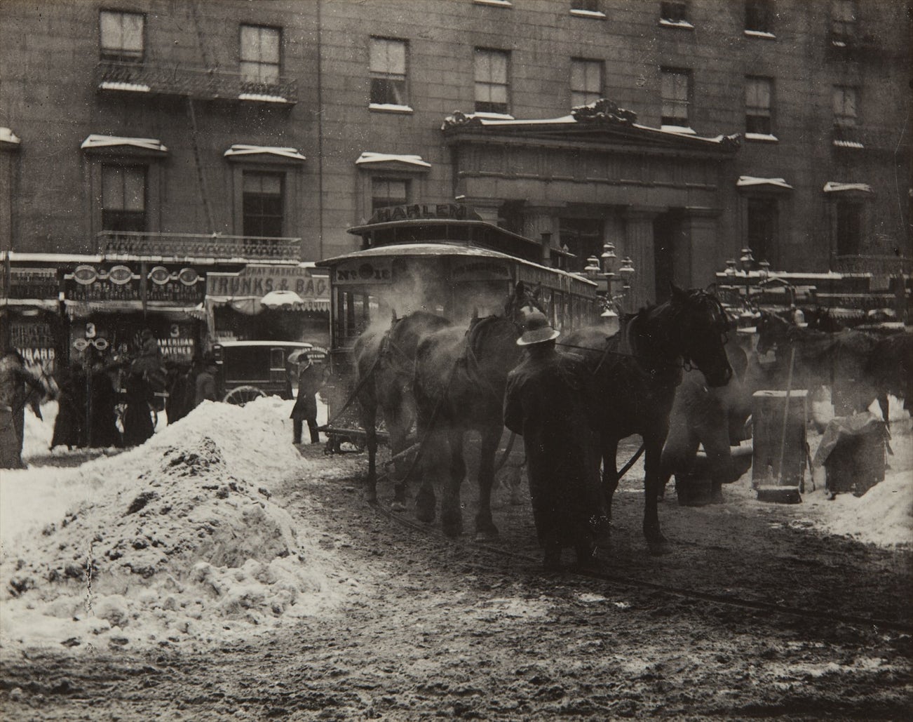 Realized as a gelatin silver print, The Terminal is a modern image that captures the gritty realism of the street. In the photograph offered here, Stieglitz has also expanded the cropping from earlier versions, showing far more of the area surrounding the streetcar and its horses, and including the optometrist’s shop sign on the left.
