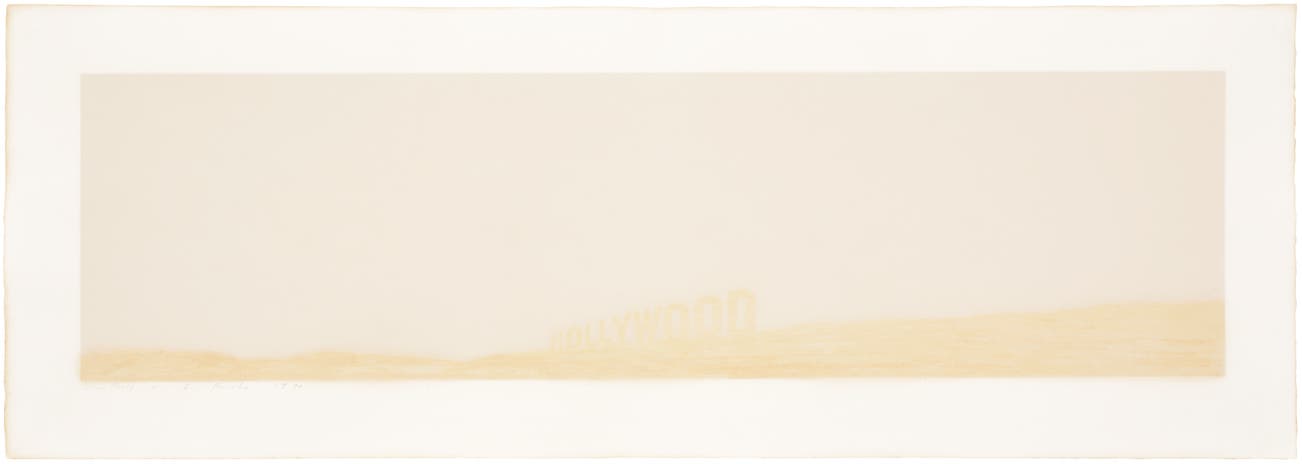 His most iconic works are at turns poetic and deadpan, epigrammatic text with nods to advertising copy, juxtaposed with imagery that is either cinematic and sublime or seemingly wry documentary. Whether the subject is his iconic Standard Gas Station or the Hollywood Sign, a parking lot or highway, his works are a distillation of American idealism, echoing the expansive Western landscape and optimism unique to postwar America.