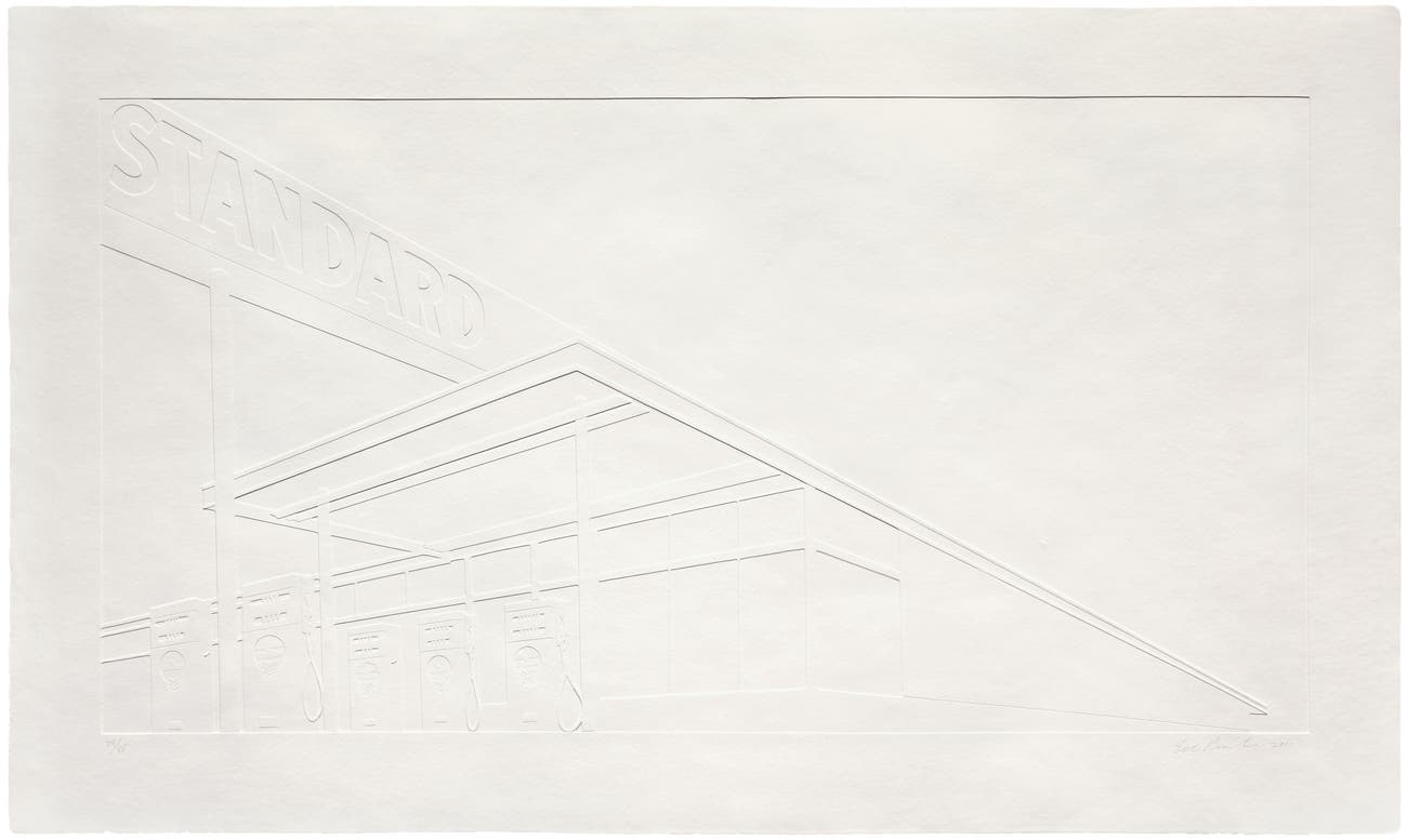 His most iconic works are at turns poetic and deadpan, epigrammatic text with nods to advertising copy, juxtaposed with imagery that is either cinematic and sublime or seemingly wry documentary. Whether the subject is his iconic Standard Gas Station or the Hollywood Sign, a parking lot or highway, his works are a distillation of American idealism, echoing the expansive Western landscape and optimism unique to postwar America.