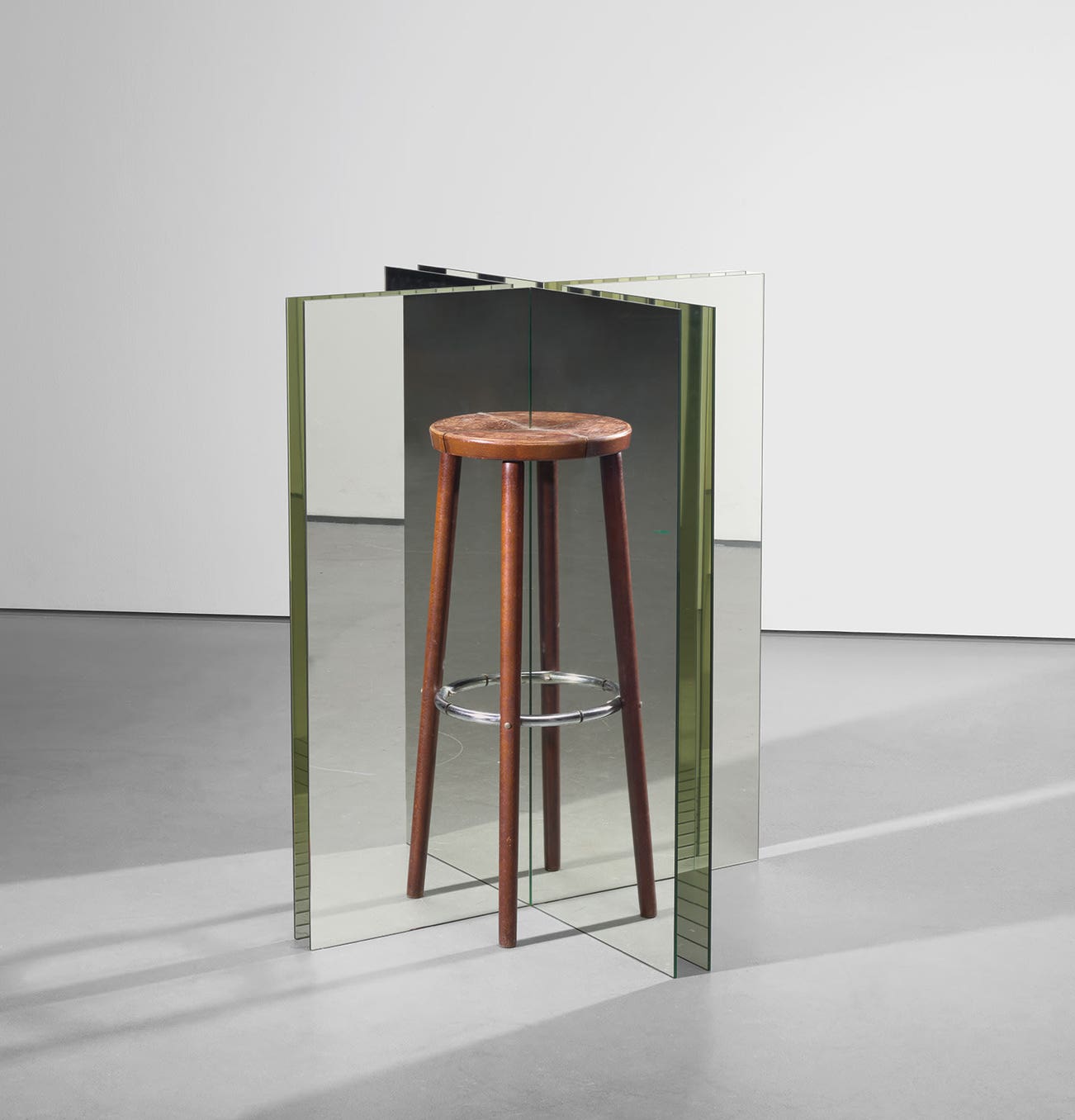 found wood and steel bar stool and mirror glass