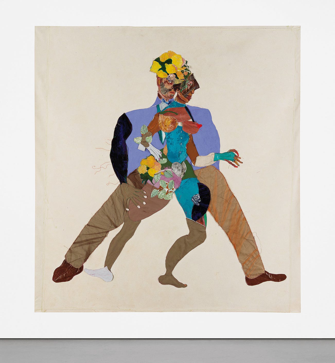 Bodies are captured in moments of dynamic movement in Tschabalala Self’s profound yet delicate works that investigate the racialized and gendered politics of the gaze through layers of canvas, sewn fabric, paint, and collage. Included in the 2017-2018 New Museum exhibition in New York, Trigger: Gender as a Tool and a Weapon, Mista & Mrs. is from a series Self executed during a residency in Naples, in which each work portrayed various figures socializing at an imagined house party hosted by Self. In the present work, two figures composed of both richly painted and collaged elements dance together in a dynamic fashion inspired by Soul Train, a dance television program that was incredibly popular in the 1970s and 1980s and celebrated African American music culture. In its sophisticated exploration of the physical, psychological, and political sides of human interaction, Mista & Mrs. is emblematic of Self’s pioneering approach which has been celebrated in the last year at her exhibitions at the Yuz Museum, Shanghai; Hammer Museum, Los Angeles; Frye Art Museum, Seattle; and MoMA PS1, New York.