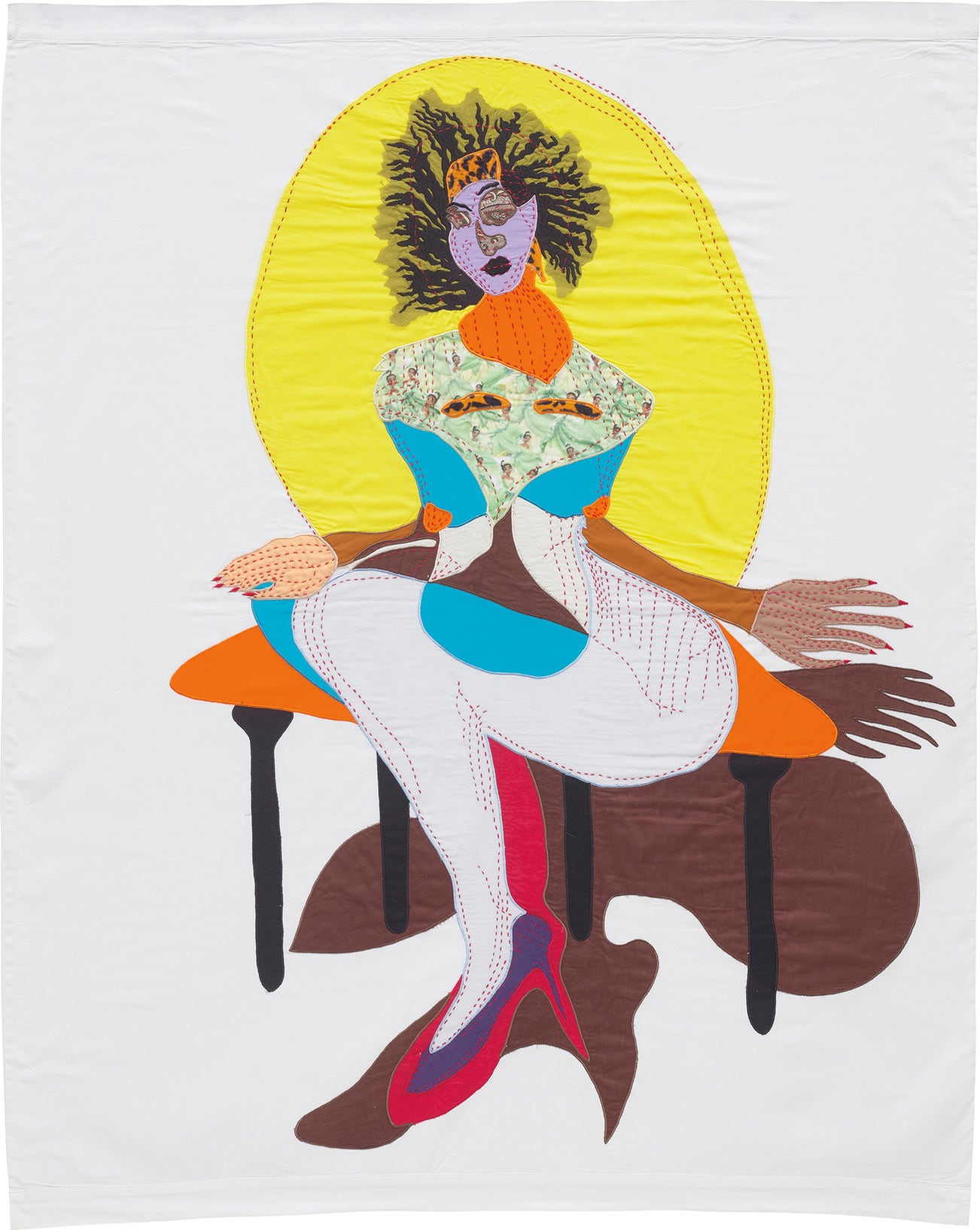 Harlem-born artist Tschabalala Self combines sewing, printing and painting in a singular style that speaks to her experience of contemporary black womanhood. Despite her extensive use of craft methods, Self considers herself to be a painter above all else. Her work is known for exaggerated colors and forms, allowing the personages within to “escape” from society’s narrow perceptions.