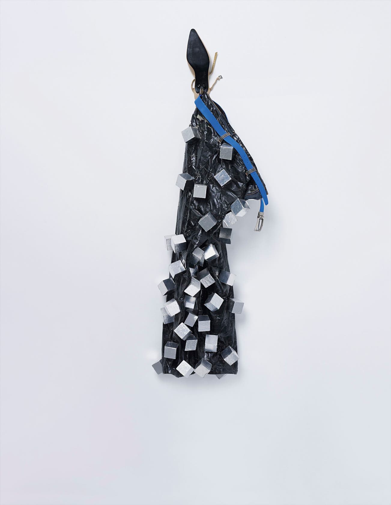 Jeans, duct tape, aluminium tape on wooden blocks, leather belt, high heel, acrylic paint