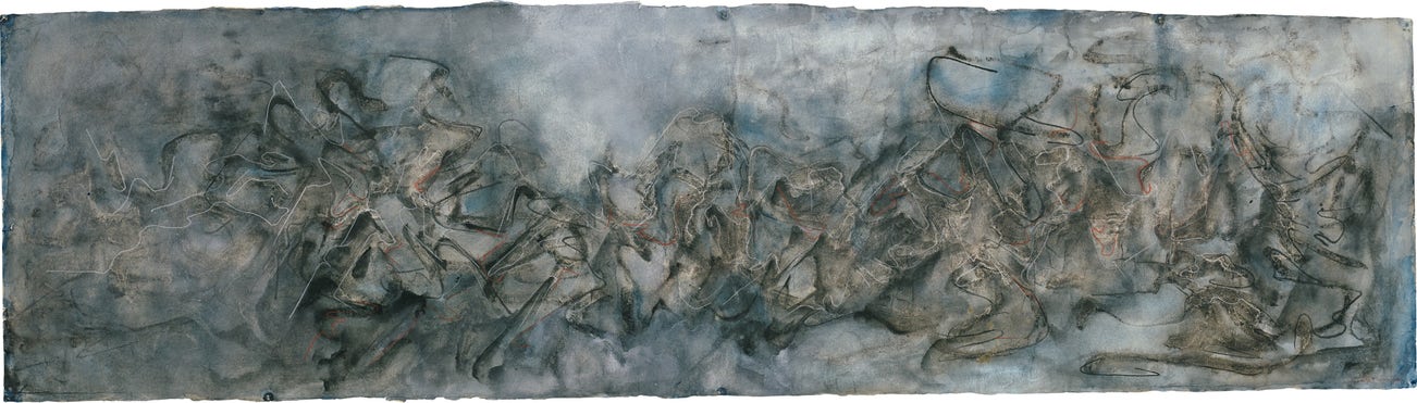 本幅作品完好地彰顯了謝景蘭獨有的優雅精緻美學。富有動態的書法筆觸在以藍色為底的紙上翩翩起舞,觀者的目光不由落在其既有韻律又細膩的抽象世界。謝景蘭在創作中融合了她對音樂和舞蹈的深刻領會,引觀者進入一個富有活力的另類世界。此作繪於謝景蘭藝術循環的最終關鍵時刻,她從抽象到具象,又回歸抽象,此次作品彰顯了其成熟完善的構圖技藝。