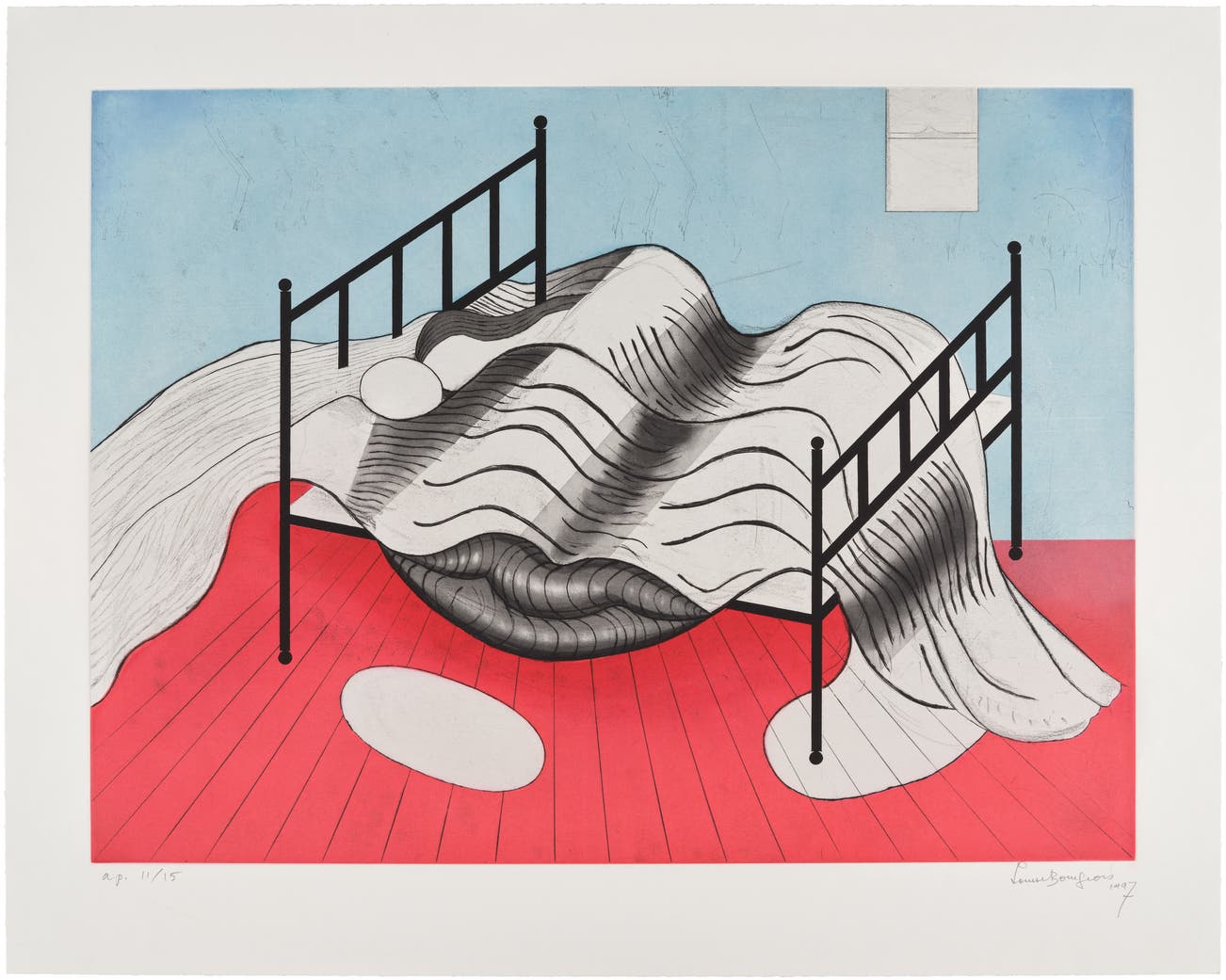 Bourgeois was a prolific printmaker, draftsman, sculptor and painter. She employed diverse materials including metal, fabric, wood, plaster, paper and paint in a range of scale — both monumental and intimate. She used recurring themes and subjects (animals, insects, architecture, the figure, text and abstraction) as form and metaphor to explore the fragility of relationships and the human body. Her artworks are meditations of emotional states: loneliness, jealousy, pride, anger, fear, love and longing.