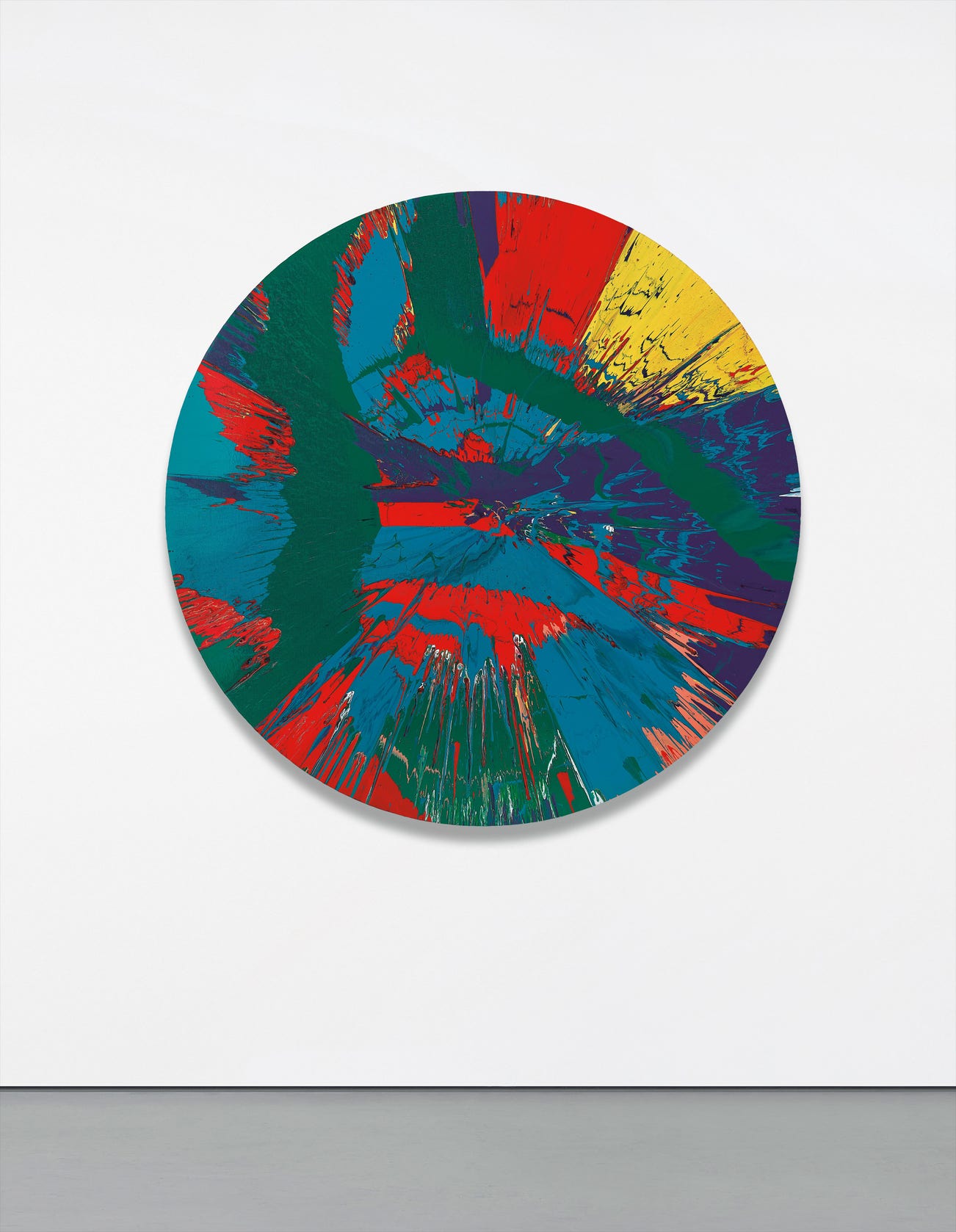 質感強烈的藍色、綠色、紅色、黃色在畫面上飛流奔放,《為最棒的安妮.蘇菲而作的美麗血腥革命超音速法國旋轉繪畫》實為達明安‧赫斯特的旋轉畫系列中的傑作。圓心畫布上,明亮的顏色從圓心向外放射,無庸置疑地展現了其旋轉畫系列鼓舞人心的自發性。赫斯特表示,「旋轉畫是一股龐大力量的乍現,充滿生命力、色彩和樂觀主義。」(「達明安‧赫斯特在2012年奧運閉幕典禮展示令人為之驚豔的旋轉畫作品」,2012年8月9日,節錄自藝術家網站:http://www.damienhirst.com/news/2012/olympics) 旋轉畫讓人聯想起在唱片機上旋轉著黑膠唱片,也像是赫斯特用拉長曝光來捕捉星辰轉動的攝影系列。然而,相較於其他同系列作品,呈現於此的拍品有一特殊之處——畫面上,濃烈的色彩沿著直徑向外邊界擴散,微妙地叫人憶起遠景中的地平線。