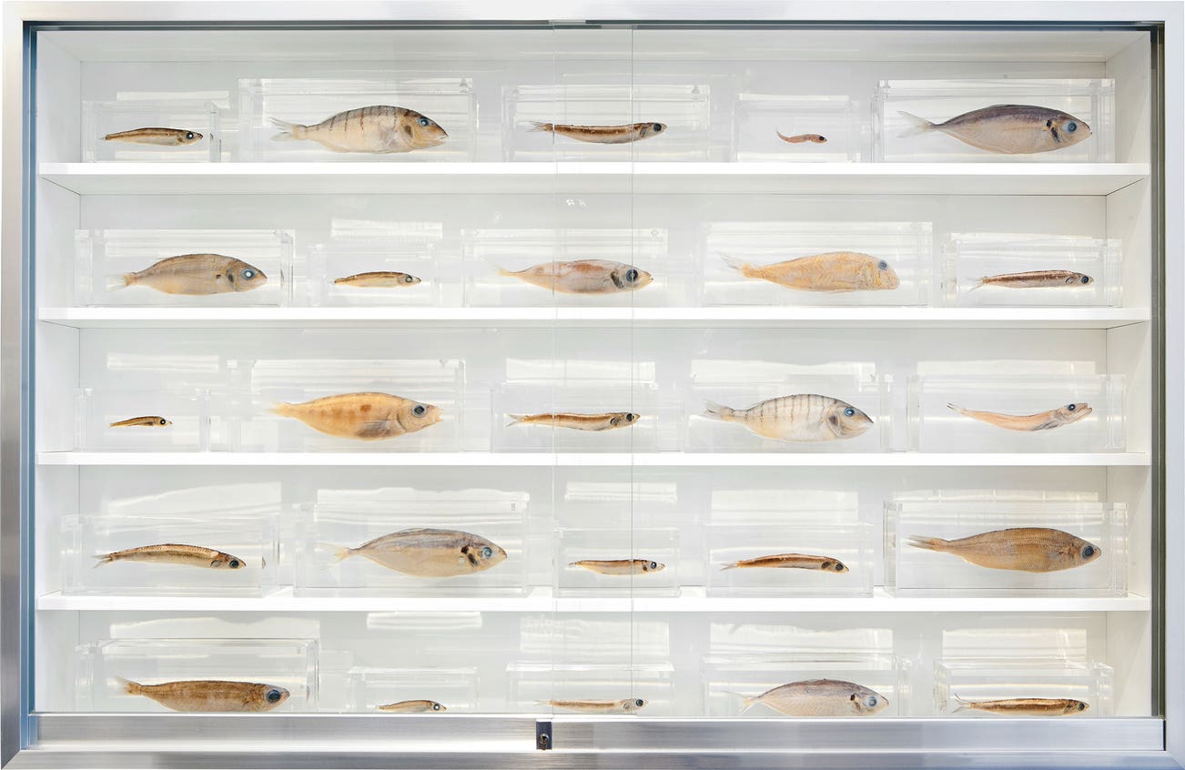 Hirst remains genre-defying and creates everything from sculpture, prints, works on paper and paintings to installation and objects. Another of his most celebrated series, the 'Pill Cabinets' present rows of intricate pills, cast individually in metal, plaster and resin, in sterilized glass and steel containers; Phillips New York showed the largest of these pieces ever exhibited in the United States, The Void, 2000, in May 2017.