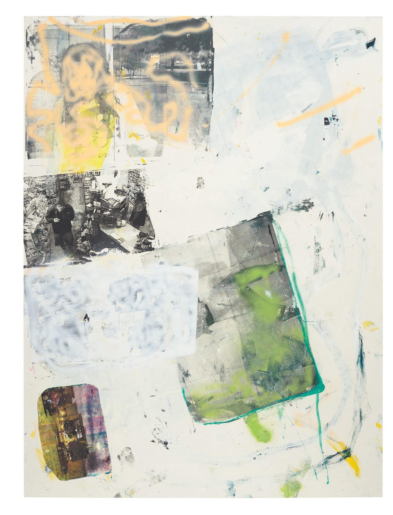 lacquer, spray paint, acrylic silkscreen and paper collage on canvas