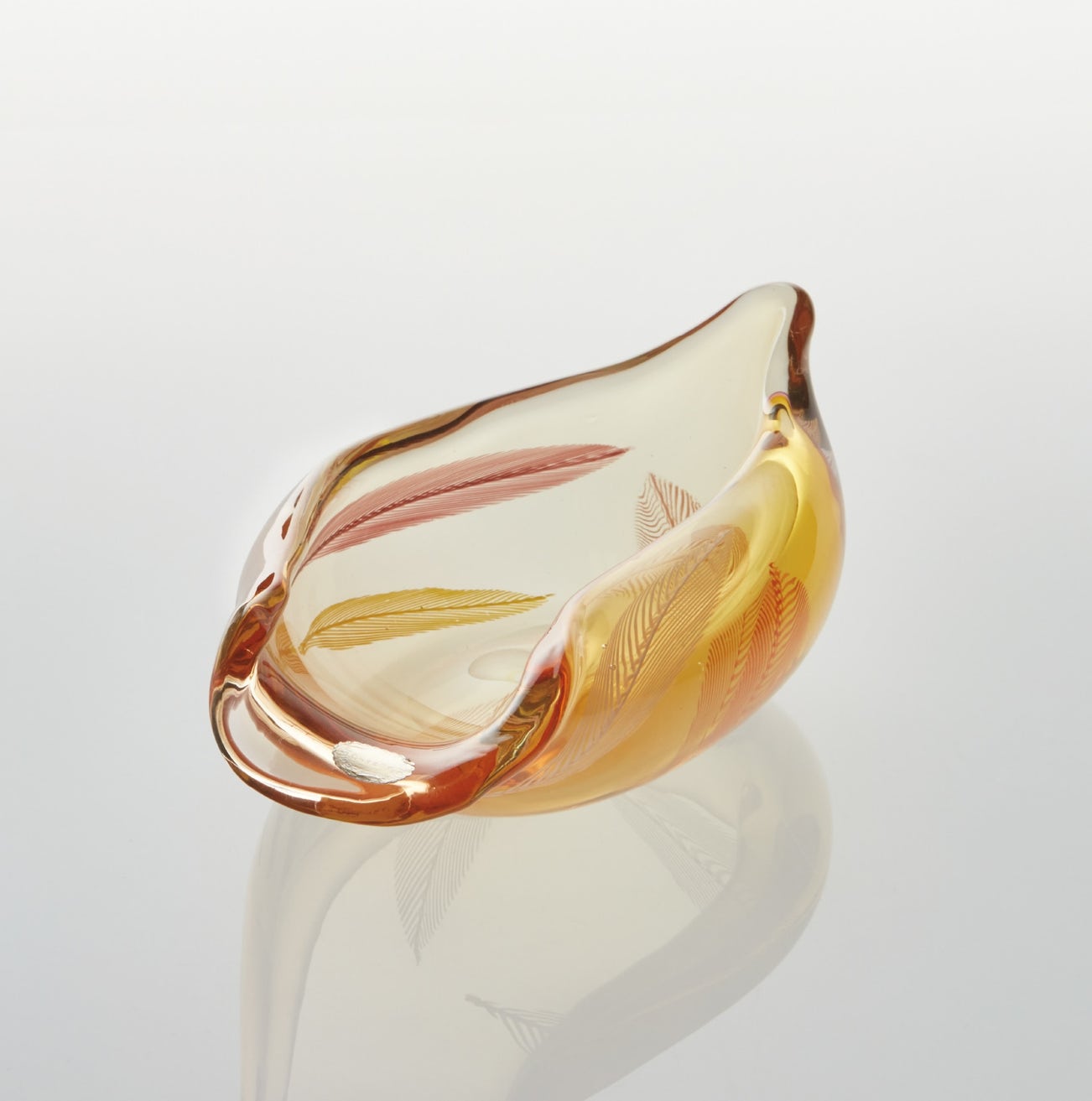 Blown glass with internal decoration.