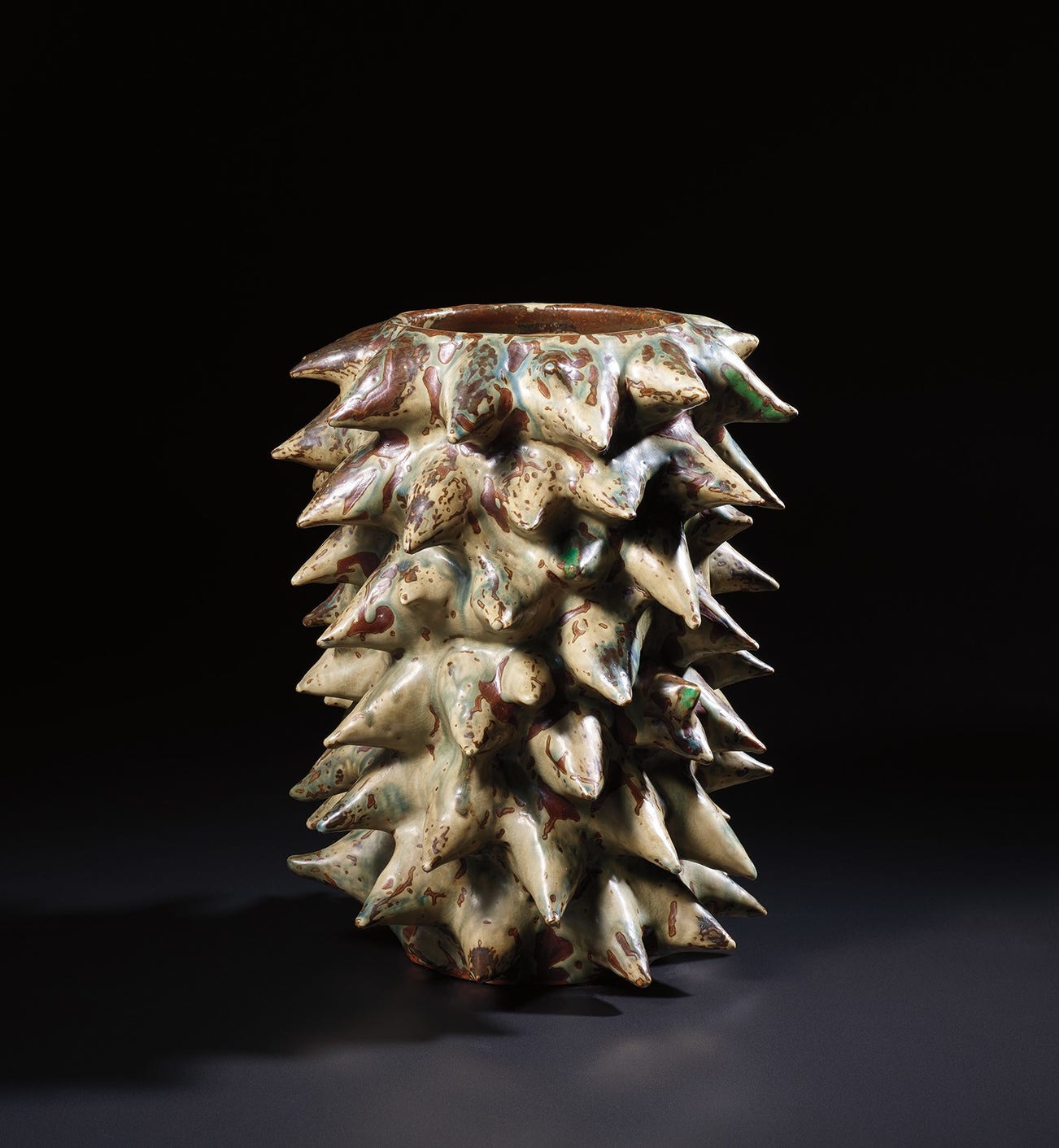 The present work is a unique variation of the Sprouting Style vase designs Axel Salto created for Royal Copenhagen. In his 1949 book Den spirende Stil, Salto describes these works as expressing movement or growth, writing, ‘the vase is like a living organism; the body buds, the buds develop, and a sprouting—even prickly—vessel results from the urgency of life within’. The present sprouting vase is an experimental and unusually large example, which notably features combined nodes, alongside the single nodes that typically comprise these vessels in the Sprouting Style. Additionally, the work features a vivid emerald green glaze, not known in any other example of Salto’s work for Royal Copenhagen.