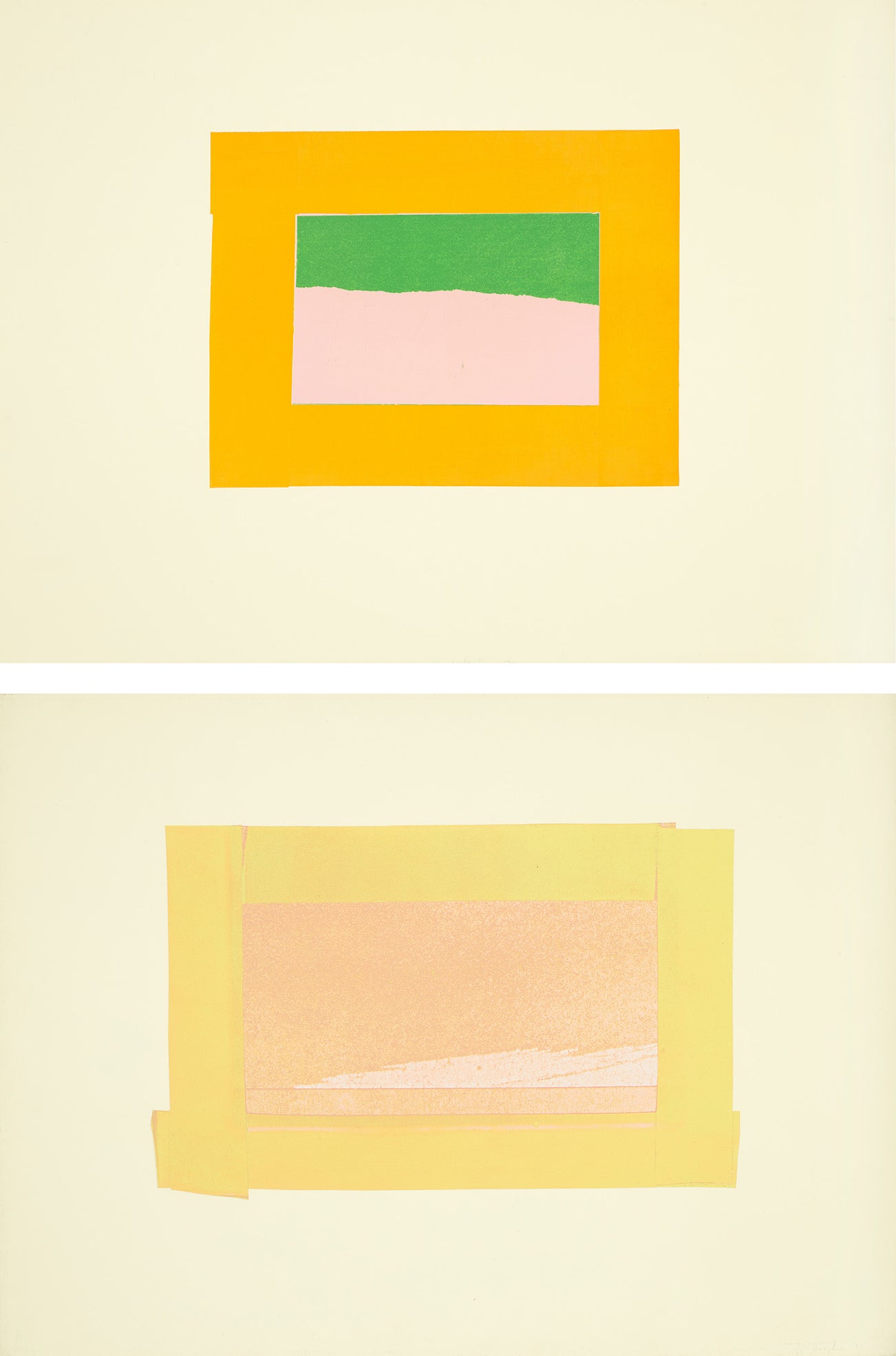 The seemingly casual, urgent quality of his paintings and prints belies a drawn-out process of making: it could take a year for Hodgkin to prepare to execute a single brushstroke. The resultant maximalist, saturated works on canvas, paper, wood and board can be intimately scaled and jewel-like, or oversized, opulent and theatrical. Whilst his early compositions have a collaged, geometric flatness, Hodgkin's later work (including etching and aquatint prints) increasingly incorporated more lush surface textures and complex, fluid patterns reminiscent of the Pahari miniatures from India, of which he was an avid collector.