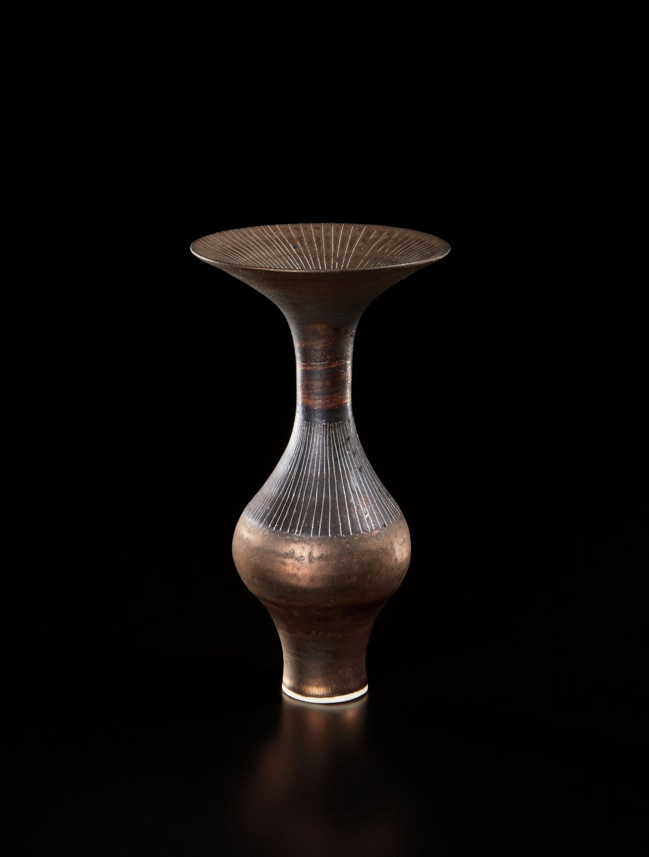 Austrian | B. 1902 D. 1995Dame Lucie Rie studied under Michael Powolny at the Kunstgewerbeschule in Vienna before immigrating to London in 1938. In London she started out making buttons for the fashion industry before producing austere, sparsely decorated tableware that caught the attention of modernist interior decorators. Eventually she hit her stride with the pitch-perfect footed bowls and flared vases for which she is best-known today. She worked in porcelain and stoneware, applying glaze directly to the unfired body and firing only once. She limited decoration to incised lines, subtle spirals and golden manganese lips, allowing the beauty of her thin-walled vessels to shine through. In contrast with the rustic pots of English ceramicist Bernard Leach, who is considered an heir to the Arts and Crafts movement, collectors and scholars revere Rie for creating pottery that was in dialogue with the design and architecture of European Modernism.