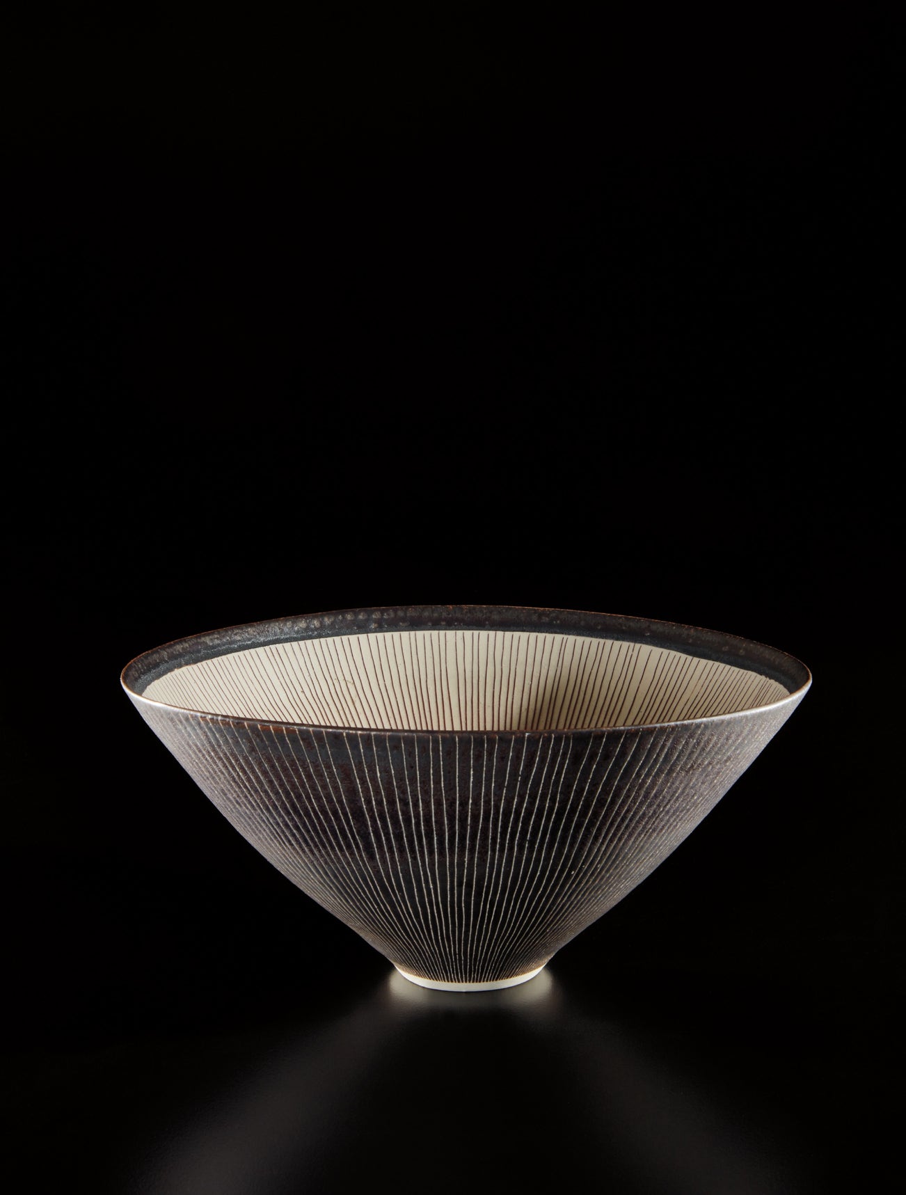 Austrian | B. 1902 D. 1995Dame Lucie Rie studied under Michael Powolny at the Kunstgewerbeschule in Vienna before immigrating to London in 1938. In London she started out making buttons for the fashion industry before producing austere, sparsely decorated tableware that caught the attention of modernist interior decorators. Eventually she hit her stride with the pitch-perfect footed bowls and flared vases for which she is best-known today. She worked in porcelain and stoneware, applying glaze directly to the unfired body and firing only once. She limited decoration to incised lines, subtle spirals and golden manganese lips, allowing the beauty of her thin-walled vessels to shine through. In contrast with the rustic pots of English ceramicist Bernard Leach, who is considered an heir to the Arts and Crafts movement, collectors and scholars revere Rie for creating pottery that was in dialogue with the design and architecture of European Modernism.