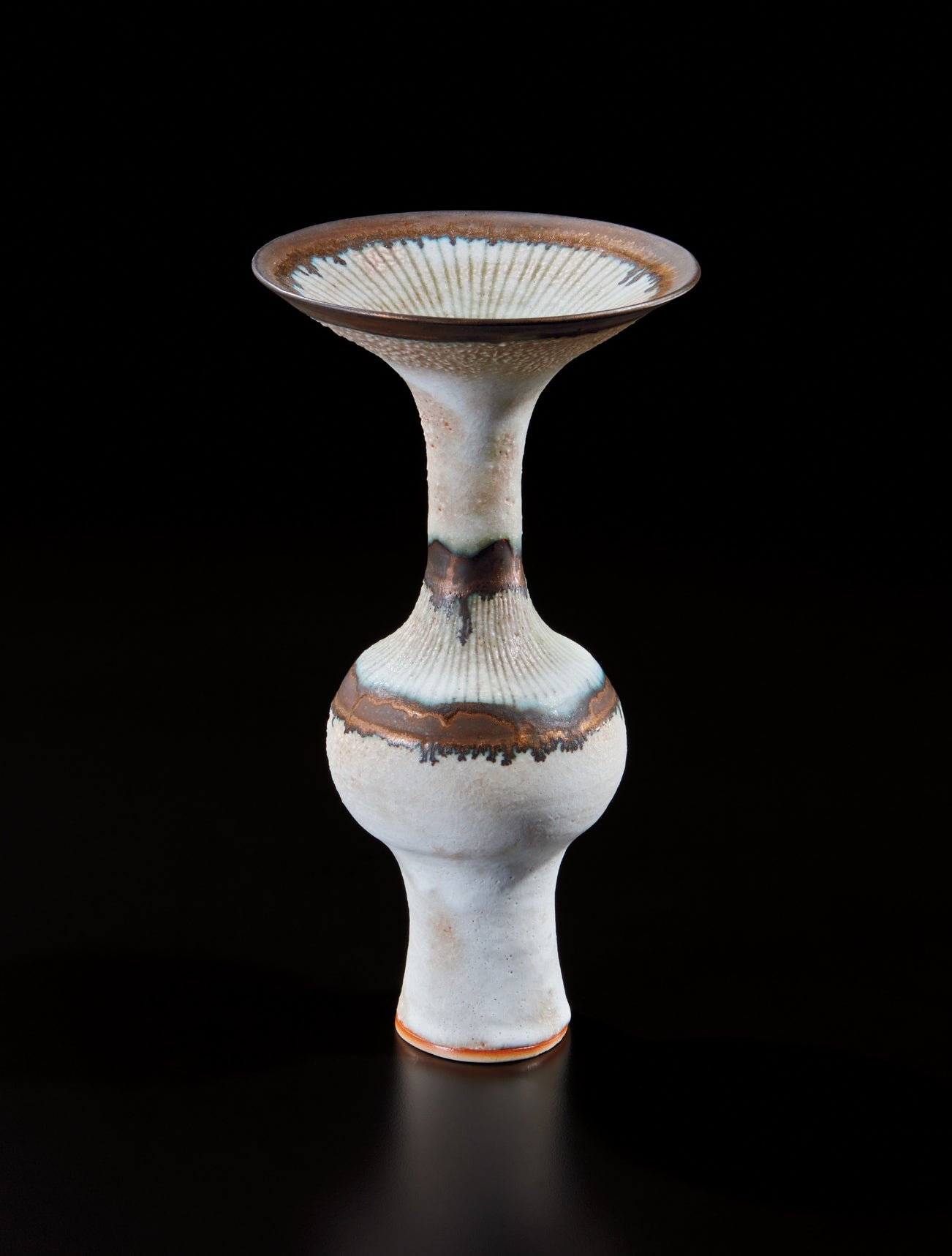Austrian | B. 1902 D. 1995Dame Lucie Rie studied under Michael Powolny at the Kunstgewerbeschule in Vienna before immigrating to London in 1938. In London she started out making buttons for the fashion industry before producing austere, sparsely decorated tableware that caught the attention of modernist interior decorators. Eventually she hit her stride with the pitch-perfect footed bowls and flared vases for which she is best-known today. She worked in porcelain and stoneware, applying glaze directly to the unfired body and firing only once. She limited decoration to incised lines, subtle spirals and golden manganese lips, allowing the beauty of her thin-walled vessels to shine through. In contrast with the rustic pots of English ceramicist Bernard Leach, who is considered an heir to the Arts and Crafts movement, collectors and scholars revere Rie for creating pottery that was in dialogue with the design and architecture of European Modernism.