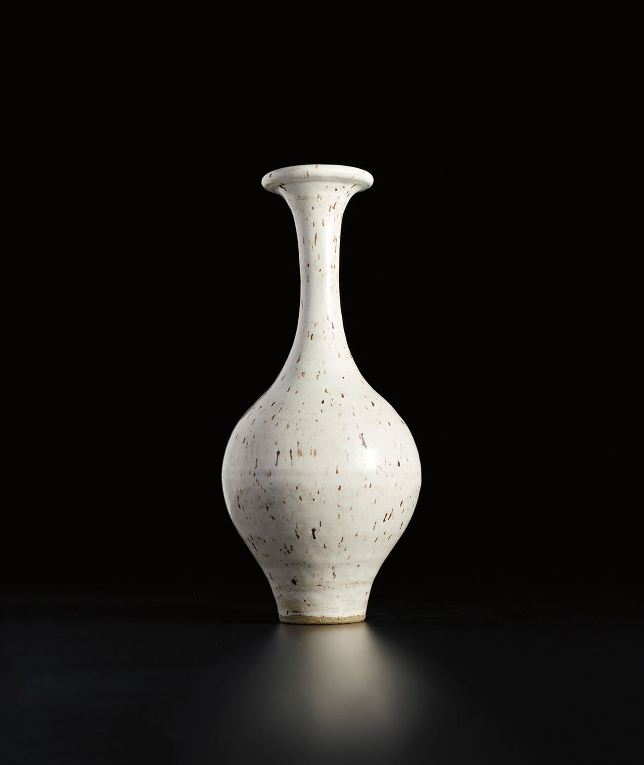 Dame Lucie Rie studied under Michael Powolny at the Kunstgewerbeschule in Vienna before immigrating to London in 1938. In London she started out making buttons for the fashion industry before producing austere, sparsely decorated tableware that caught the attention of modernist interior decorators. Eventually she hit her stride with the pitch-perfect footed bowls and flared vases for which she is best-known today. She worked in porcelain and stoneware, applying glaze directly to the unfired body and firing only once. She limited decoration to incised lines, subtle spirals and golden manganese lips, allowing the beauty of her thin-walled vessels to shine through. In contrast with the rustic pots of English ceramicist Bernard Leach, who is considered an heir to the Arts and Crafts movement, collectors and scholars revere Rie for creating pottery that was in dialogue with the design and architecture of European Modernism.
