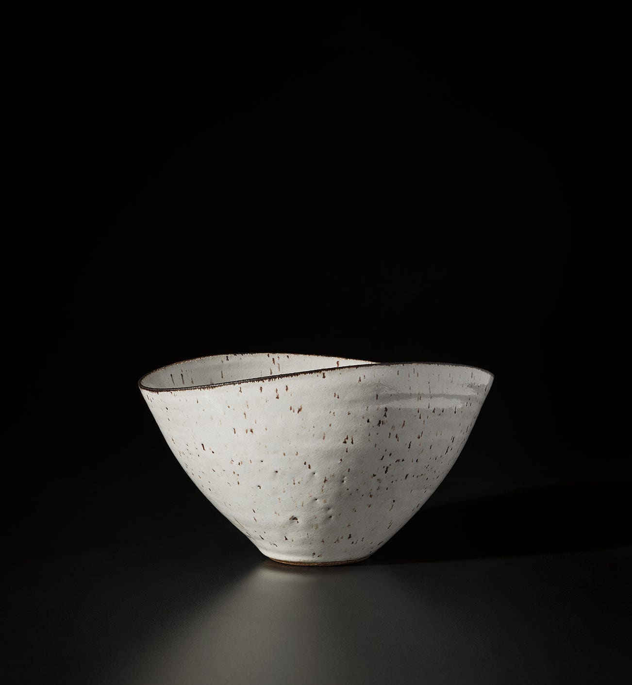 Austrian | B. 1902 D. 1995Dame Lucie Rie studied under Michael Powolny at the Kunstgewerbeschule in Vienna before immigrating to London in 1938. In London she started out making buttons for the fashion industry before producing austere, sparsely decorated tableware that caught the attention of modernist interior decorators. Eventually she hit her stride with the pitch-perfect footed bowls and flared vases for which she is best-known today. She worked in porcelain and stoneware, applying glaze directly to the unfired body and firing only once. She limited decoration to incised lines, subtle spirals and golden manganese lips, allowing the beauty of her thin-walled vessels to shine through. In contrast with the rustic pots of English ceramicist Bernard Leach, who is considered an heir to the Arts and Crafts movement, collectors and scholars revere Rie for creating pottery that was in dialogue with the design and architecture of European Modernism.