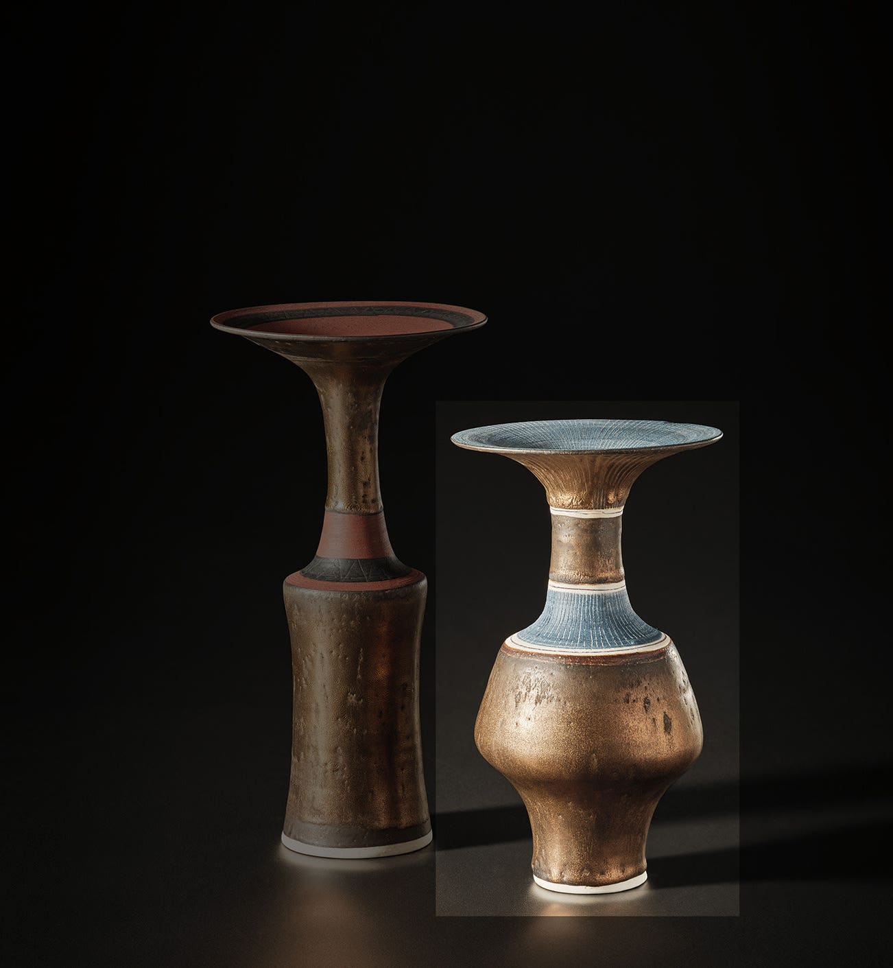 Dame Lucie Rie studied under Michael Powolny at the Kunstgewerbeschule in Vienna before immigrating to London in 1938. In London she started out making buttons for the fashion industry before producing austere, sparsely decorated tableware that caught the attention of modernist interior decorators. Eventually she hit her stride with the pitch-perfect footed bowls and flared vases for which she is best-known today. She worked in porcelain and stoneware, applying glaze directly to the unfired body and firing only once. She limited decoration to incised lines, subtle spirals and golden manganese lips, allowing the beauty of her thin-walled vessels to shine through. In contrast with the rustic pots of English ceramicist Bernard Leach, who is considered an heir to the Arts and Crafts movement, collectors and scholars revere Rie for creating pottery that was in dialogue with the design and architecture of European Modernism.