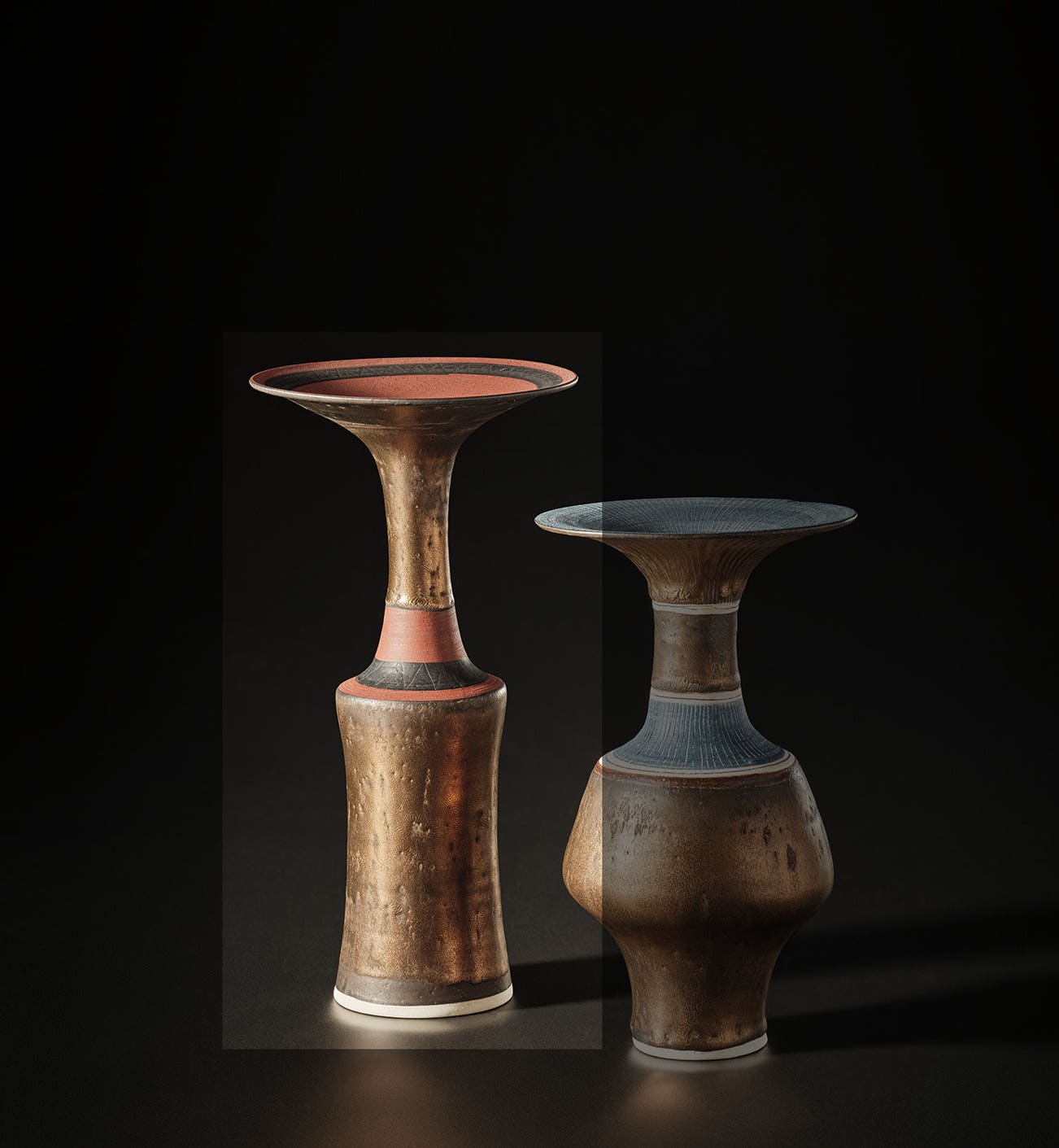 Dame Lucie Rie studied under Michael Powolny at the Kunstgewerbeschule in Vienna before immigrating to London in 1938. In London she started out making buttons for the fashion industry before producing austere, sparsely decorated tableware that caught the attention of modernist interior decorators. Eventually she hit her stride with the pitch-perfect footed bowls and flared vases for which she is best-known today. She worked in porcelain and stoneware, applying glaze directly to the unfired body and firing only once. She limited decoration to incised lines, subtle spirals and golden manganese lips, allowing the beauty of her thin-walled vessels to shine through. In contrast with the rustic pots of English ceramicist Bernard Leach, who is considered an heir to the Arts and Crafts movement, collectors and scholars revere Rie for creating pottery that was in dialogue with the design and architecture of European Modernism.