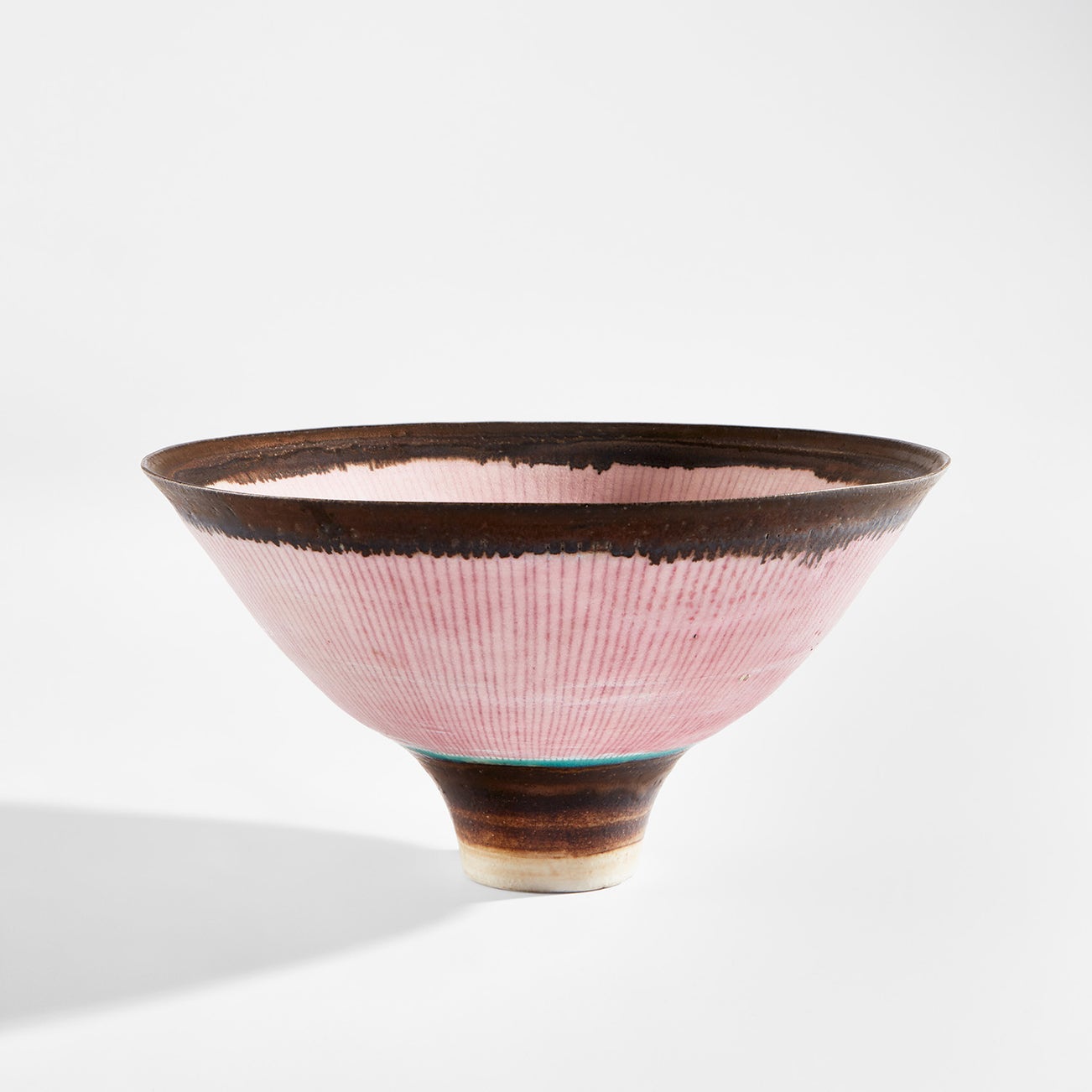 Austrian | B. 1902 D. 1995Dame Lucie Rie studied under Michael Powolny at the Kunstgewerbeschule in Vienna before immigrating to London in 1938. In London she started out making buttons for the fashion industry before producing austere, sparsely decorated tableware that caught the attention of modernist interior decorators. Eventually she hit her stride with the pitch-perfect footed bowls and flared vases for which she is best-known today. She worked in porcelain and stoneware, applying glaze directly to the unfired body and firing only once. She limited decoration to incised lines, subtle spirals and golden manganese lips, allowing the beauty of her thin-walled vessels to shine through. In contrast with the rustic pots of English ceramicist Bernard Leach, who is considered an heir to the Arts and Crafts movement, collectors and scholars revere Rie for creating pottery that was in dialogue with the design and architecture of European Modernism.