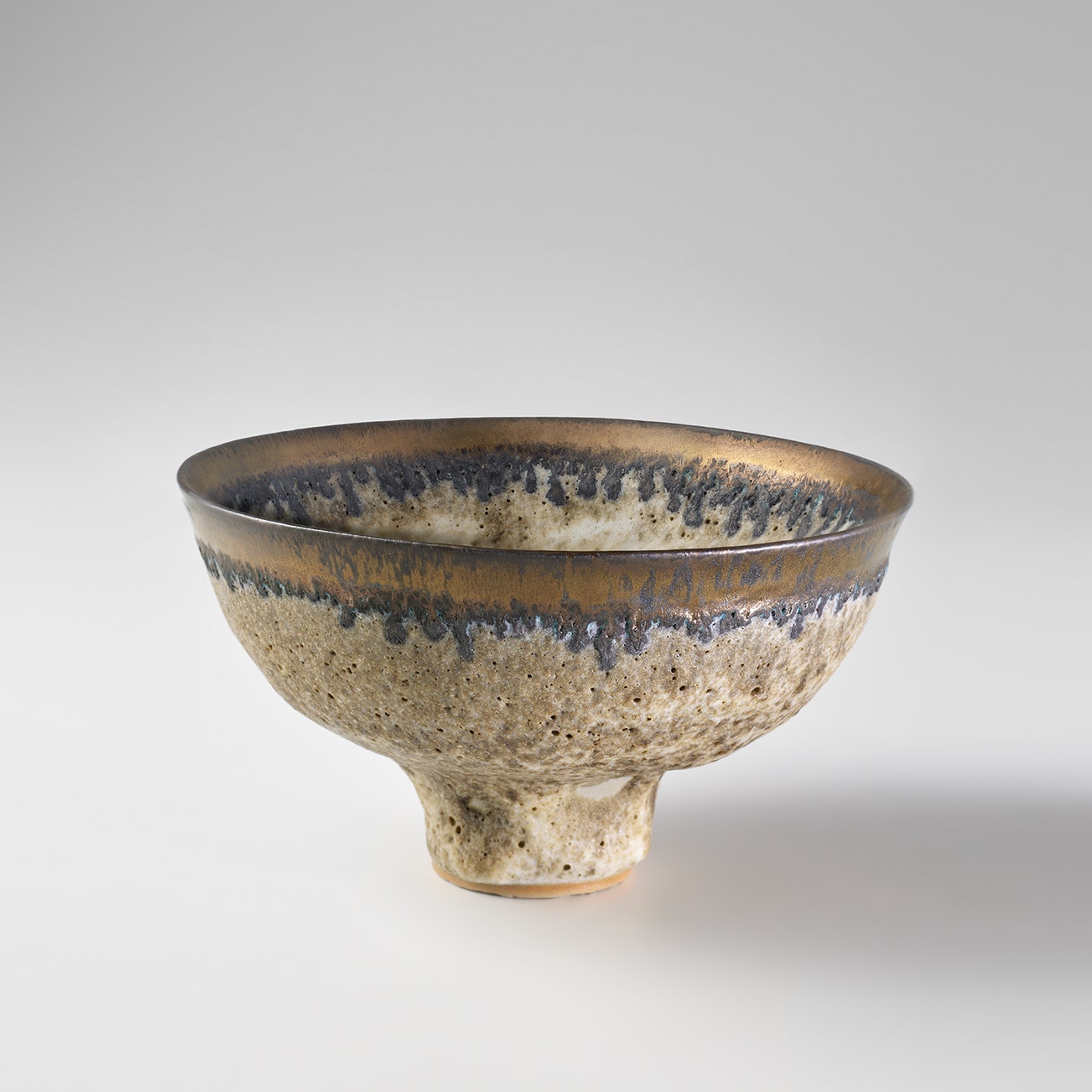 Austrian | B. 1902 D. 1995Dame Lucie Rie studied under Michael Powolny at the Kunstgewerbeschule in Vienna before immigrating to London in 1938. In London she started out making buttons for the fashion industry before producing austere, sparsely decorated tableware that caught the attention of modernist interior decorators. Eventually she hit her stride with the pitch-perfect footed bowls and flared vases for which she is best-known today. She worked in porcelain and stoneware, applying glaze directly to the unfired body and firing only once. She limited decoration to incised lines, subtle spirals and golden manganese lips, allowing the beauty of her thin-walled vessels to shine through. In contrast with the rustic pots of English ceramicist Bernard Leach, who is considered an heir to the Arts and Crafts movement, collectors and scholars revere Rie for creating pottery that was in dialogue with the design and architecture of European Modernism.