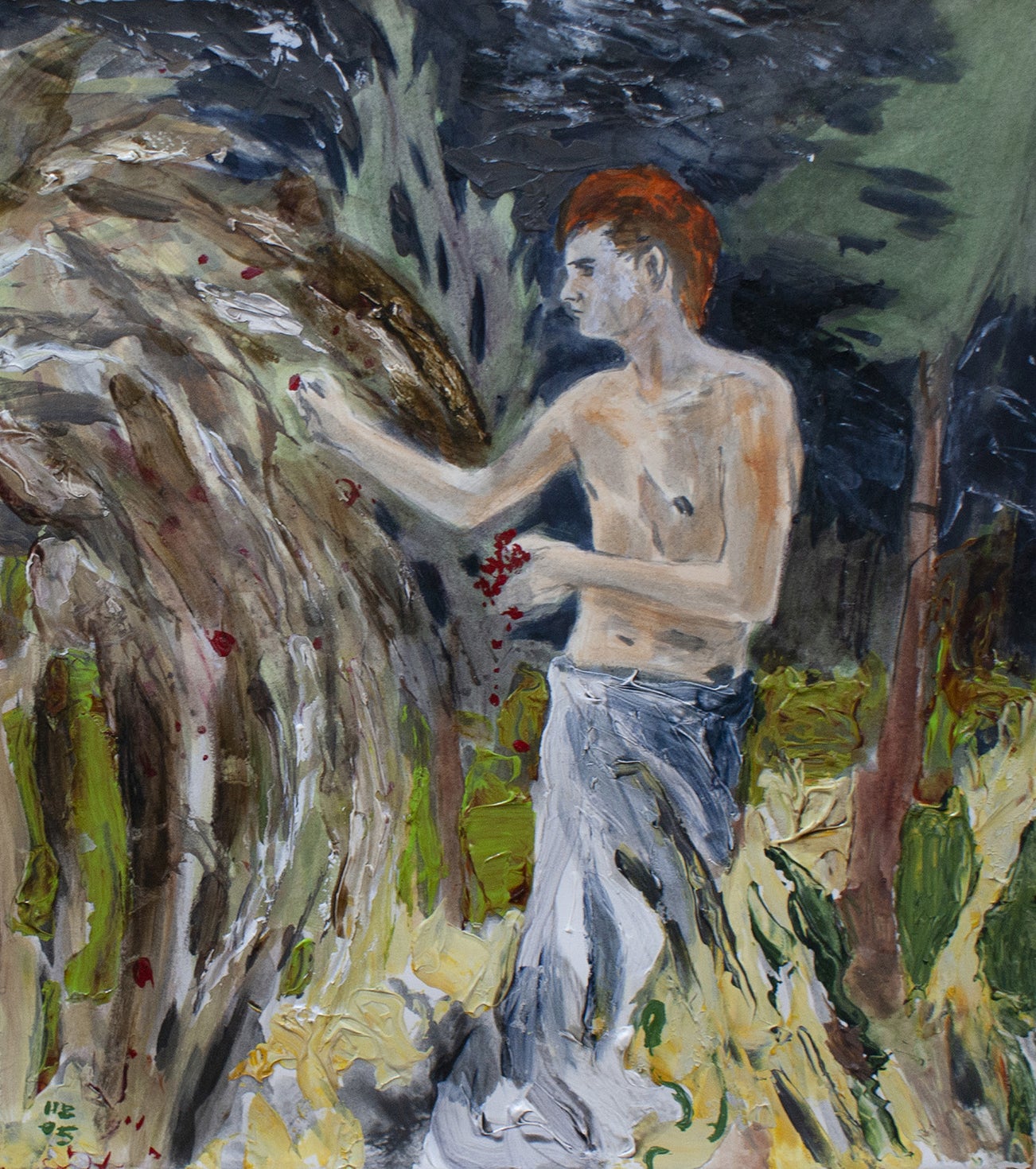Hernan Bas (b.1978) is a contemporary American painter who lives and works in Miami. His paintings are influenced by the romantic and decadent legacies of 18th and 19th century art, literature, poetry, and religion. These influences result in canvases that are complex and highly detailed and often portray characters, typically young male figures, nestled among flora and fauna.