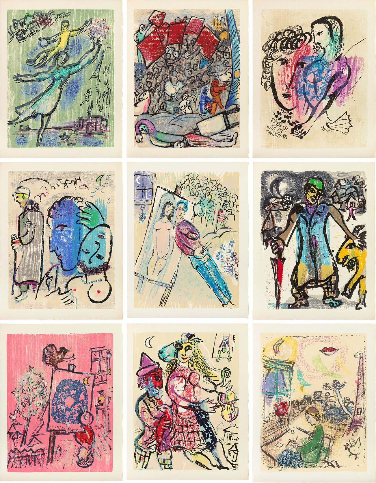 全套24組木刻版畫、6組拼貼 Rives BFK 紙本附「夏加爾」版畫(散裝及折疊如出版所示)附藝術家的法語詩歌、包裝紙、標題頁和版權頁,全部存於原裝米色布面文件夾,脊上印有金色標題和藝術家姓名,連原裝書套。